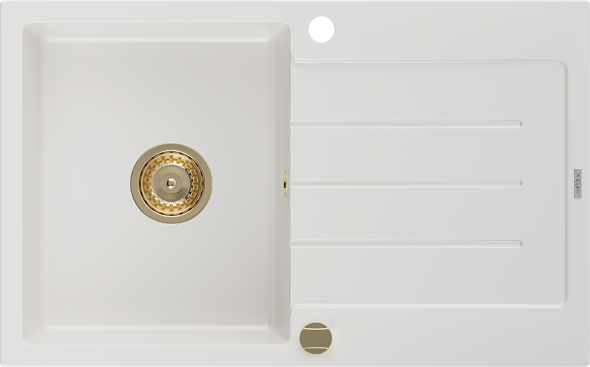 Mexen Bruno granito plautuvė su nubėgimu 1-dubens, 795 x 495 mm, balta, aukso spalvos sifonas - 6513791010-20-G