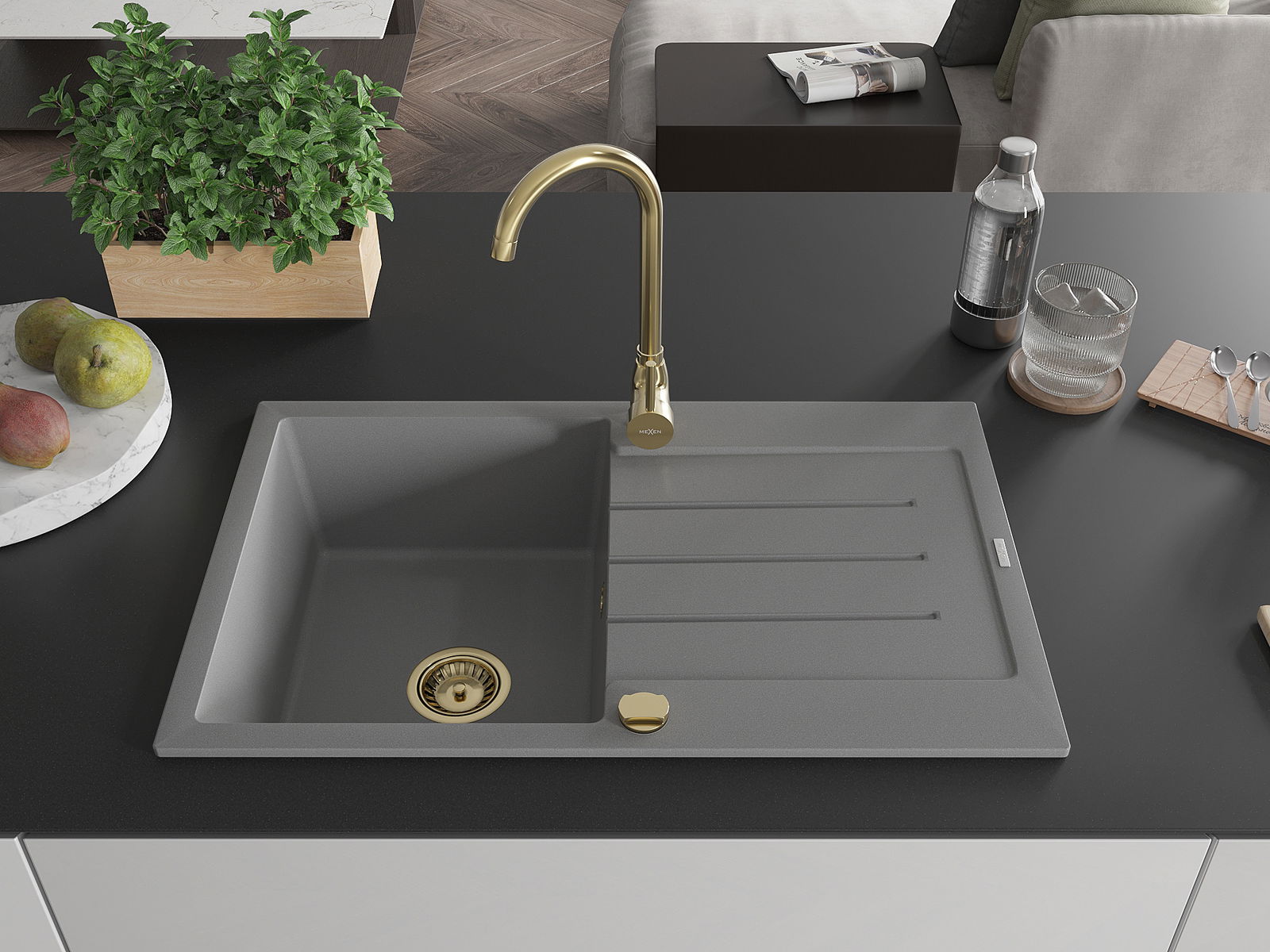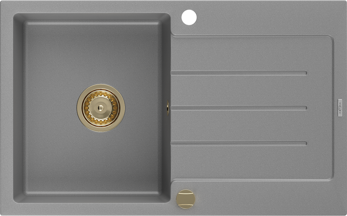 Mexen Bruno vienkamerė granitinė plautuvė su nutekėtoju 795 x 495 mm, pilka, auksinis sifonas - 6513791010-71-G