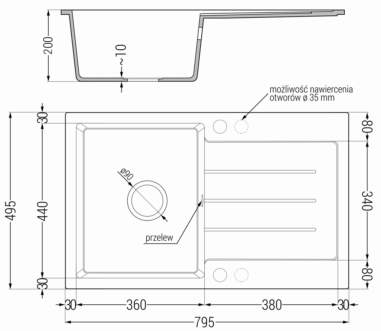 Kriauklė turi 2 sujungtas skylutes, kurių skersmuo yra 35 mm, skirtas savarankiškai. Jie gali būti naudojami, be kita ko Sumontuoti skystą balionėlį, kuris pašalins plastikinių butelių buvimą virtuvėje ir suteiks jam elegantišką apdailą.