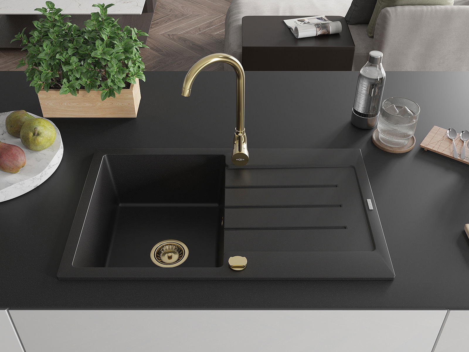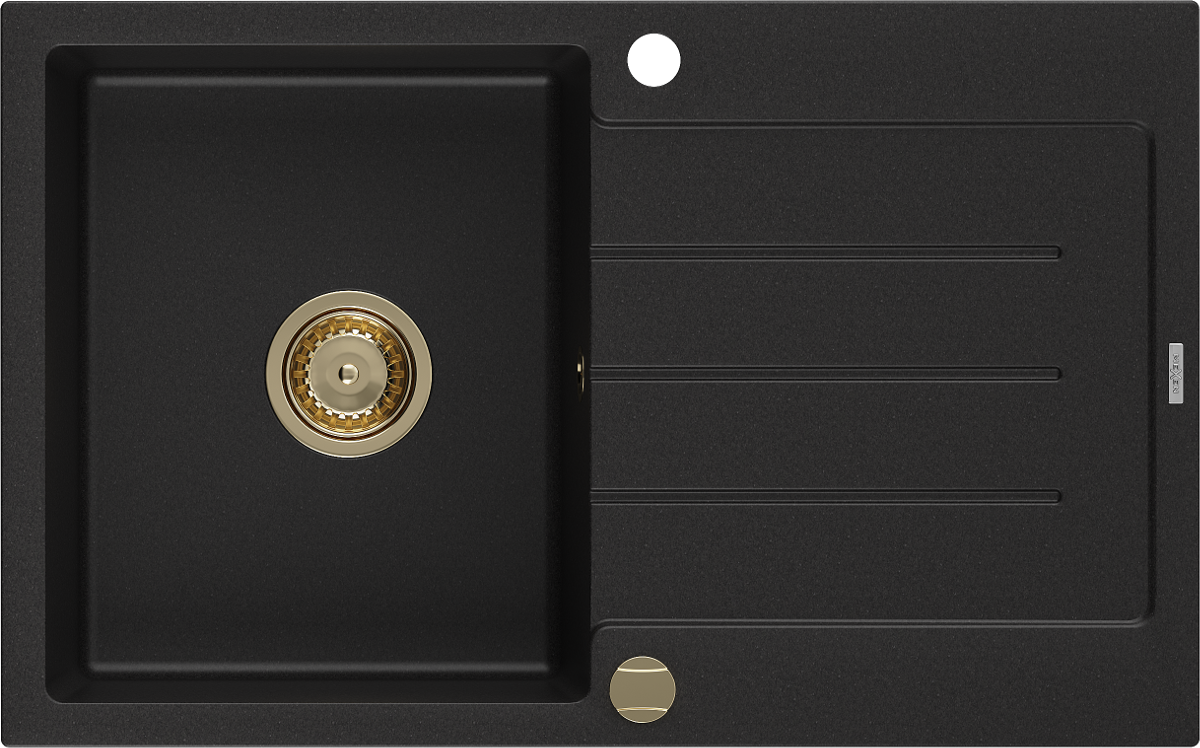 Mexen Bruno granitinis plautuvė 1 kamera su nusausinimu 795 x 495 mm, juoda, auksinis sifonas - 6513791010-77-G