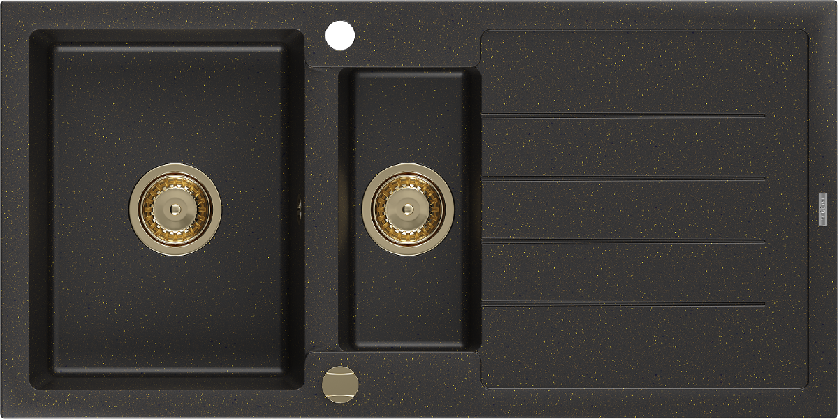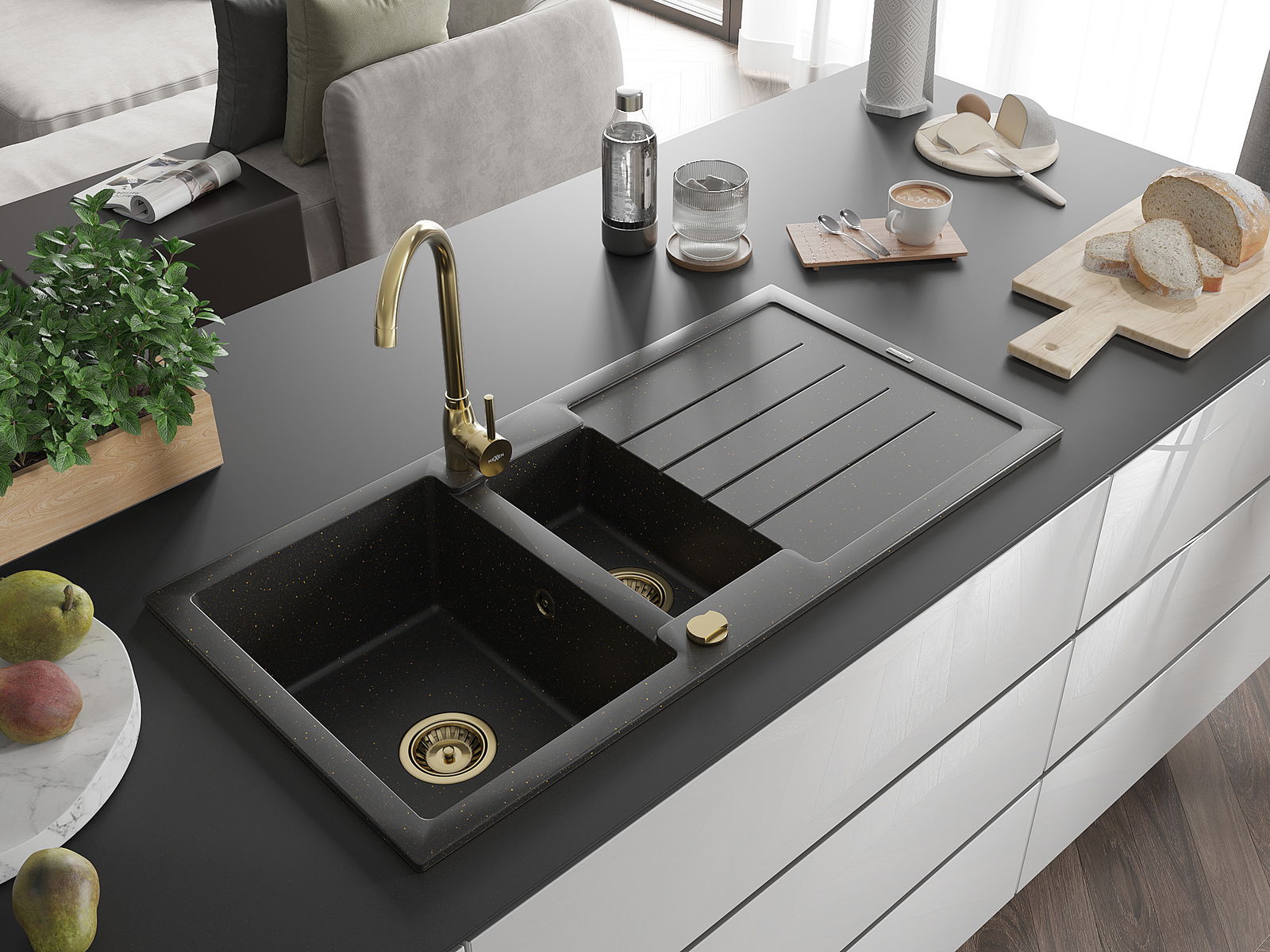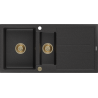 Mexen Andres 1,5 sekcijų granito kriauklė su nutekėjimu 1000 x 500 mm juoda/aukso metalo atspalvis, auksinis sifonas