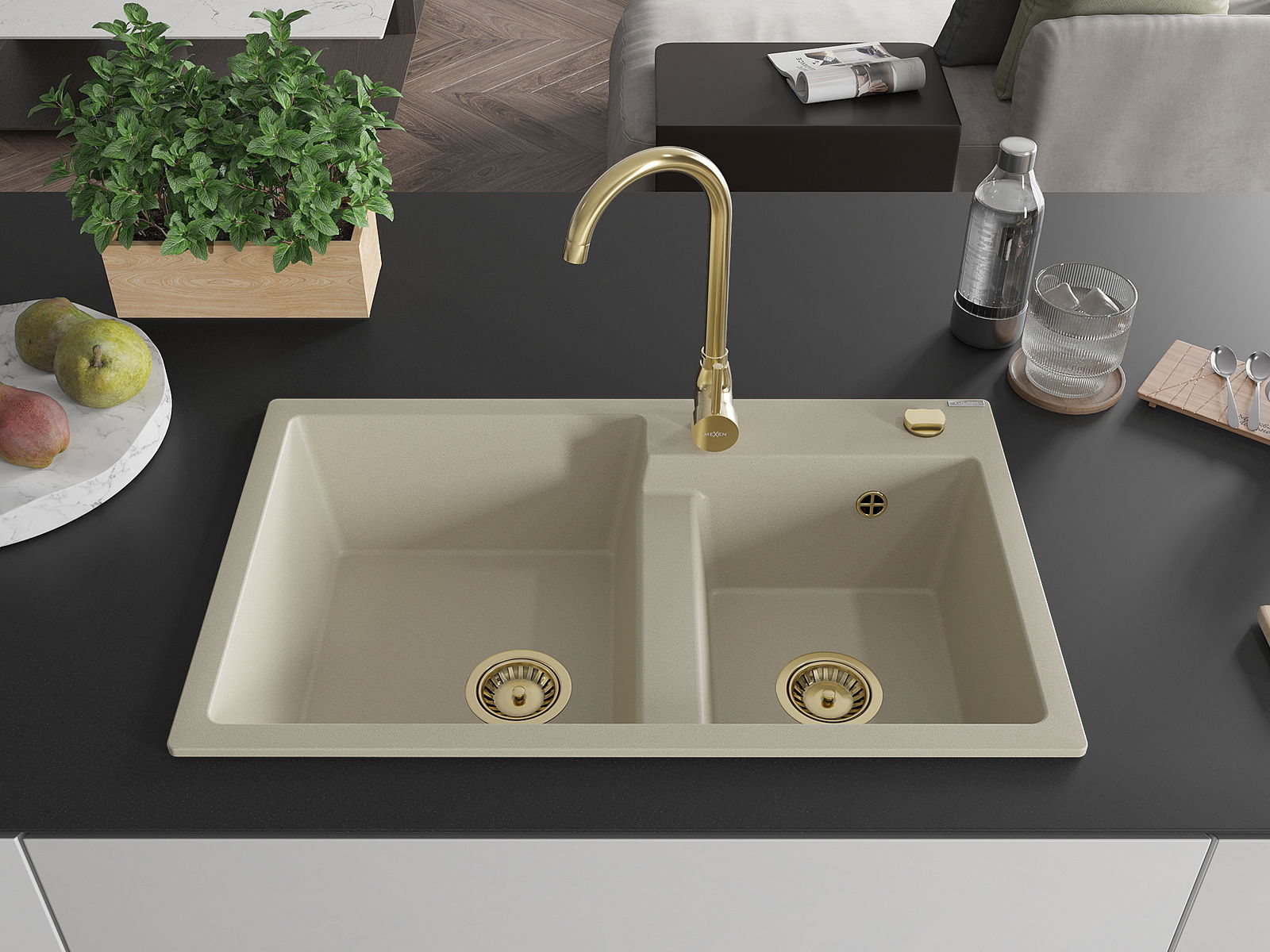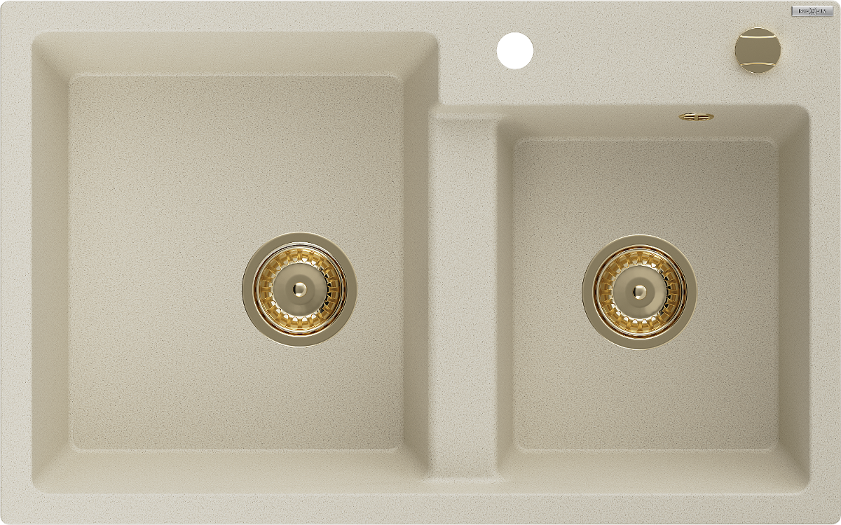 Mexen Tomas granitinė dviejų skyrių plautuvė 800 x 500 mm, smėlio spalvos, auksinis sifonas - 6516802000-69-G