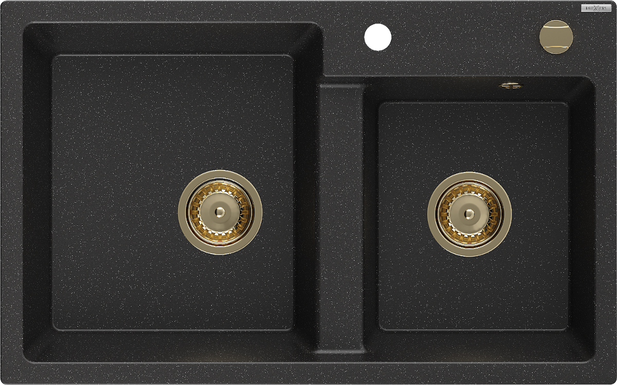 Mexen Tomas granitinė dviejų skyrių plautuvė 800 x 500 mm, juoda/sidabrinis metalikas, auksinis sifonas - 6516802000-73-G