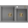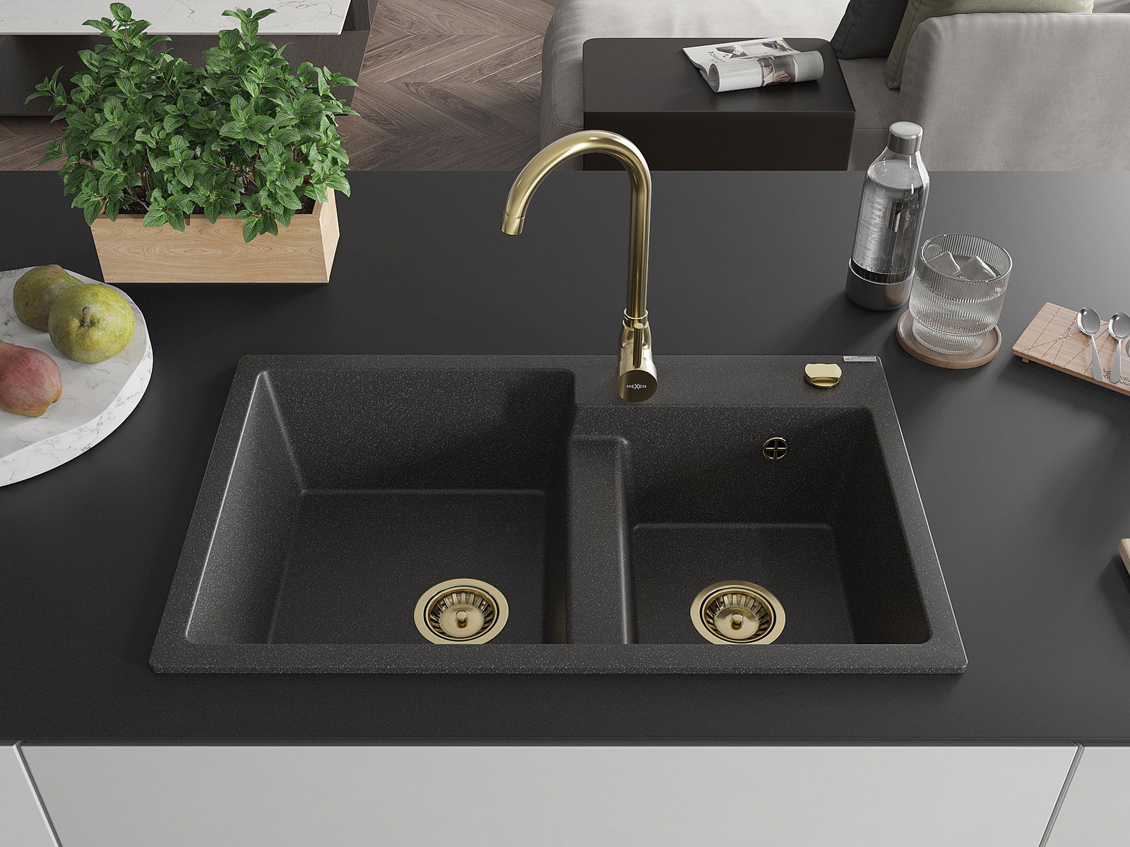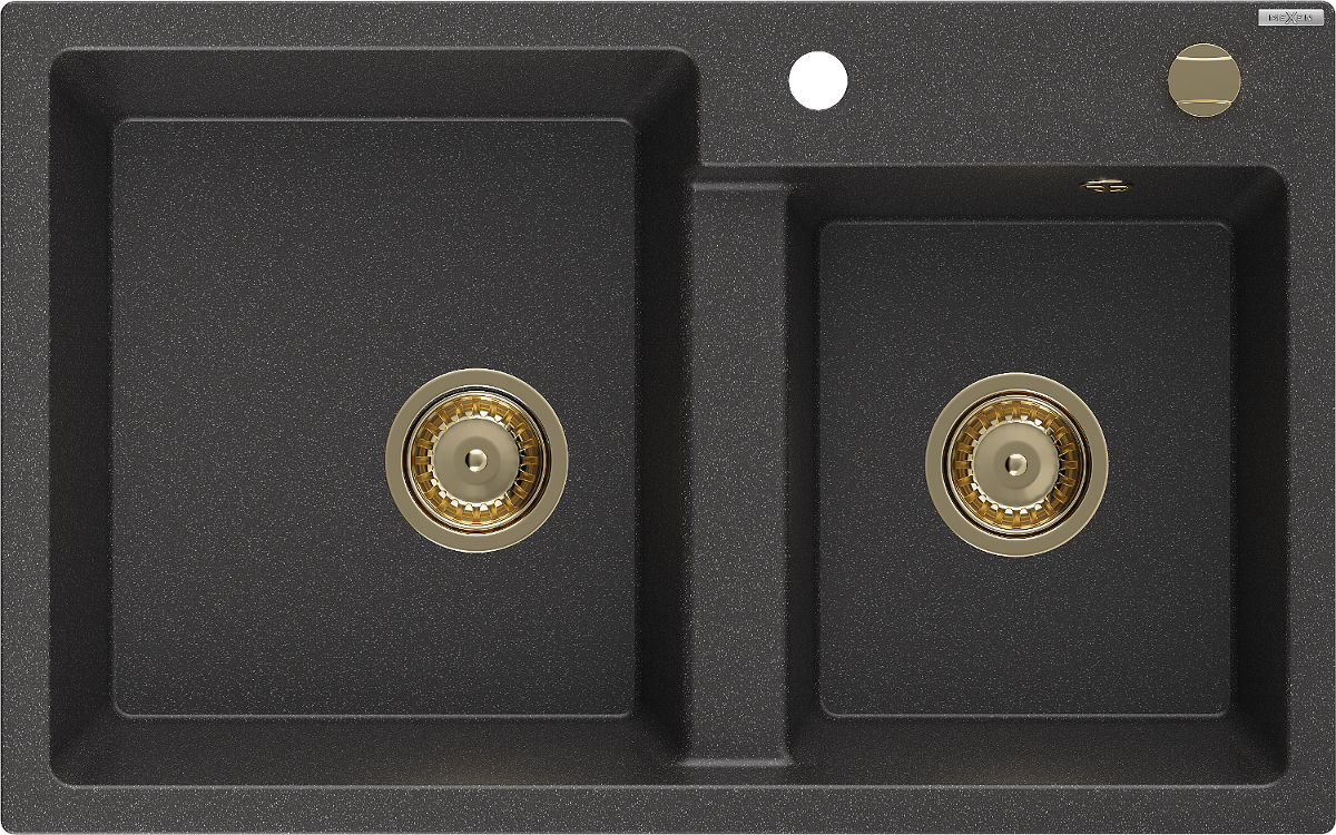 Mexen Tomas dviejų skyrių granitinė plautuvė 800 x 500 mm, juoda su dėmelėmis, auksinis sifonas - 6516802000-76-G