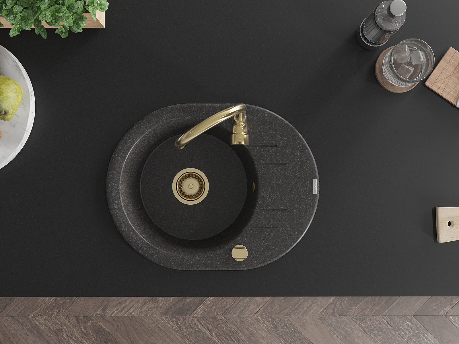 Mexen Kevin granitinė vienos kameros kriauklė su nusausintuvu 586 x 458 mm, juoda dėmėta, auksinis sifonas - 6517581005-76-G