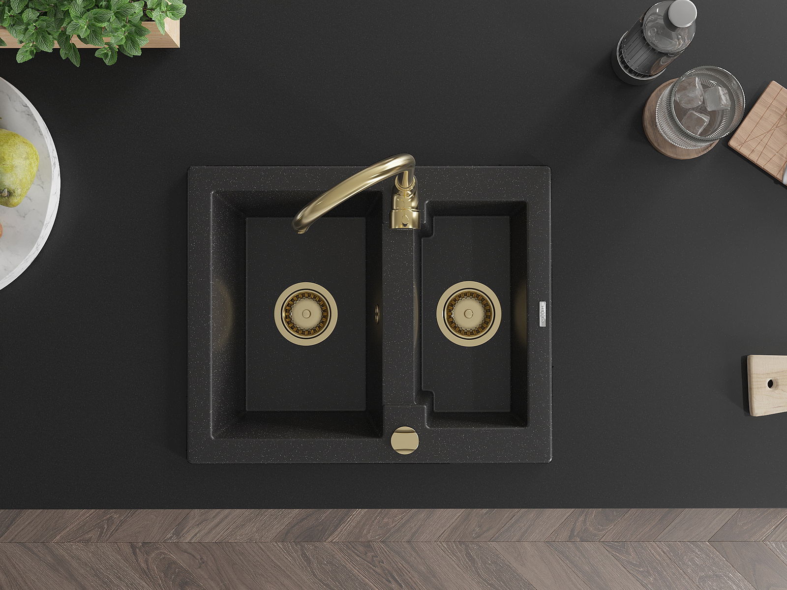Mexen Carlos granitinė plautuvė 1,5 skylių 582 x 475 mm, juoda/sidabrinė metalo, aukso sifonas - 6518581500-73-G