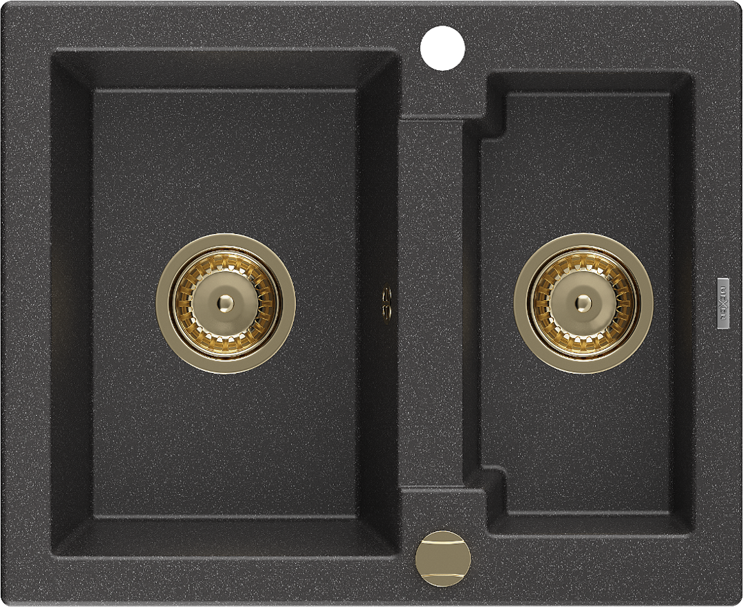 Mexen Carlos granitinė kriauklė 1,5 skyrių 582 x 475 mm, juoda su taškeliais, auksinis sifonas - 6518581500-76-G