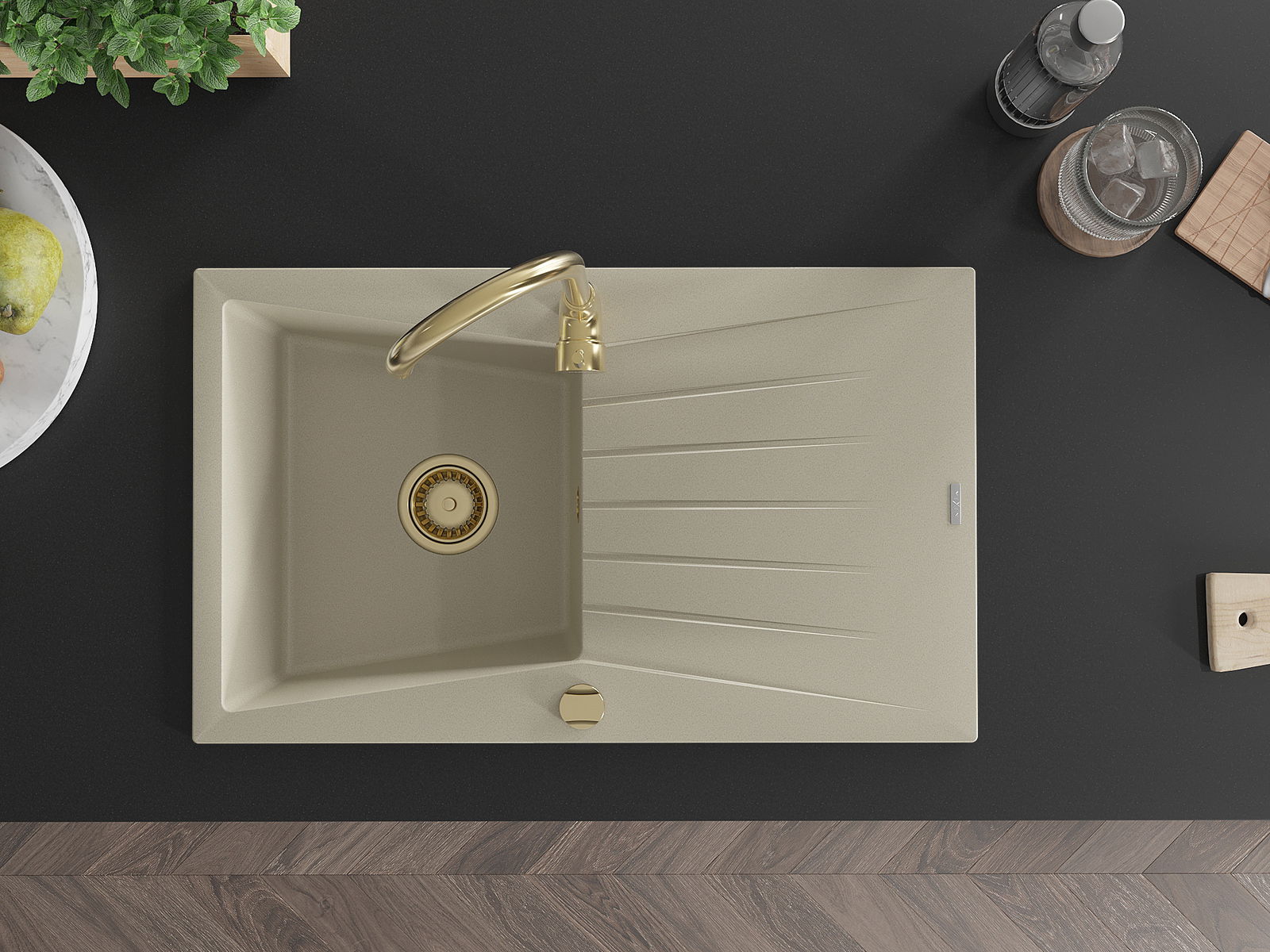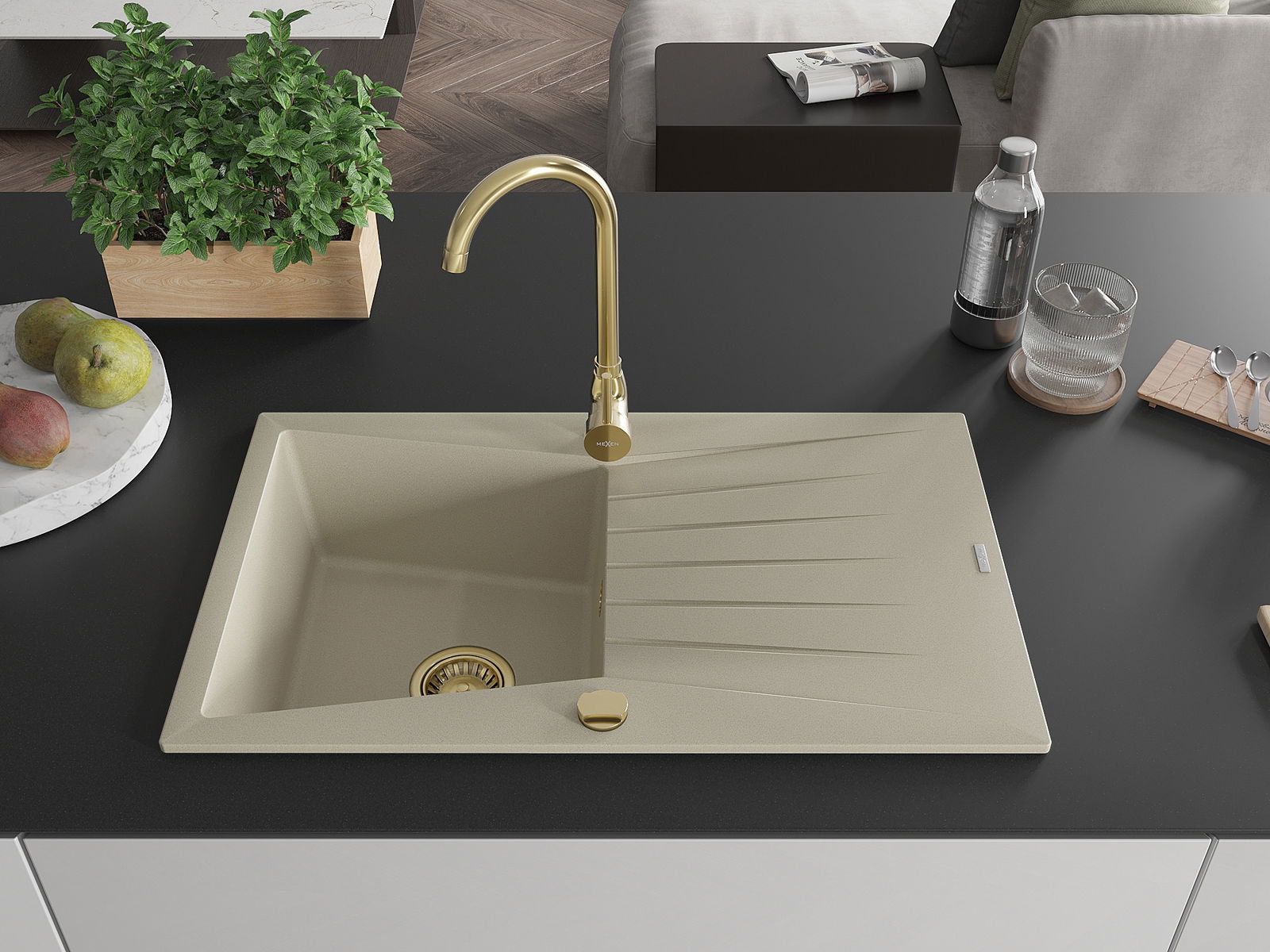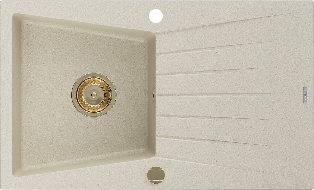 Mexen Cesar granito kriauklė su nusausintuvu, 1 skyrius, 775 x 470 mm, smėlio spalvos, sifonas auksinis - 6514771010-69-G