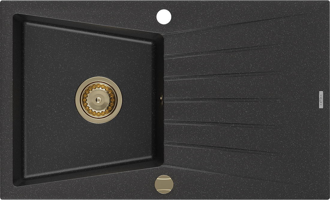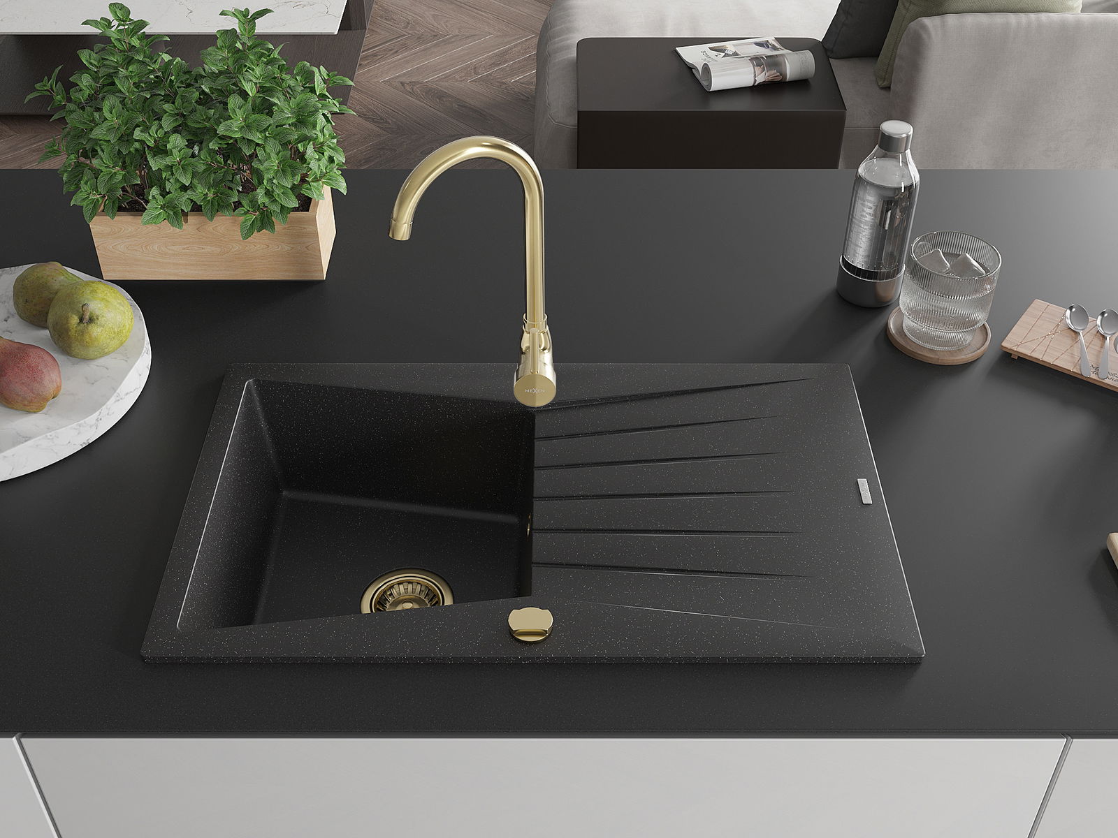 Mexen Cesar granitinė vienos kameros kriauklė su nuotėkiu 775 x 470 mm, juoda/sidabrinė metalo spalva, auksinis sifonas