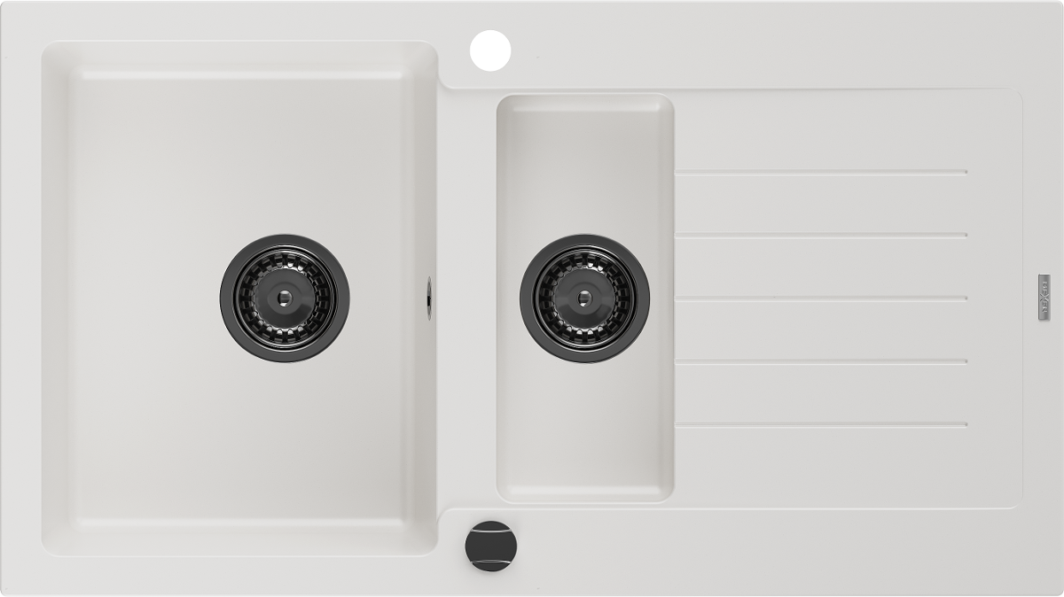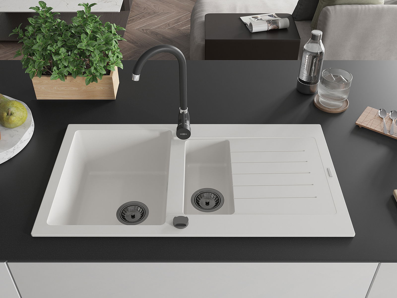 Mexen Matias granito plautuvė 1,5 skylių su nutekėjimu 900 x 505 mm, balta, juodas sifonas - 6502901505-20-B