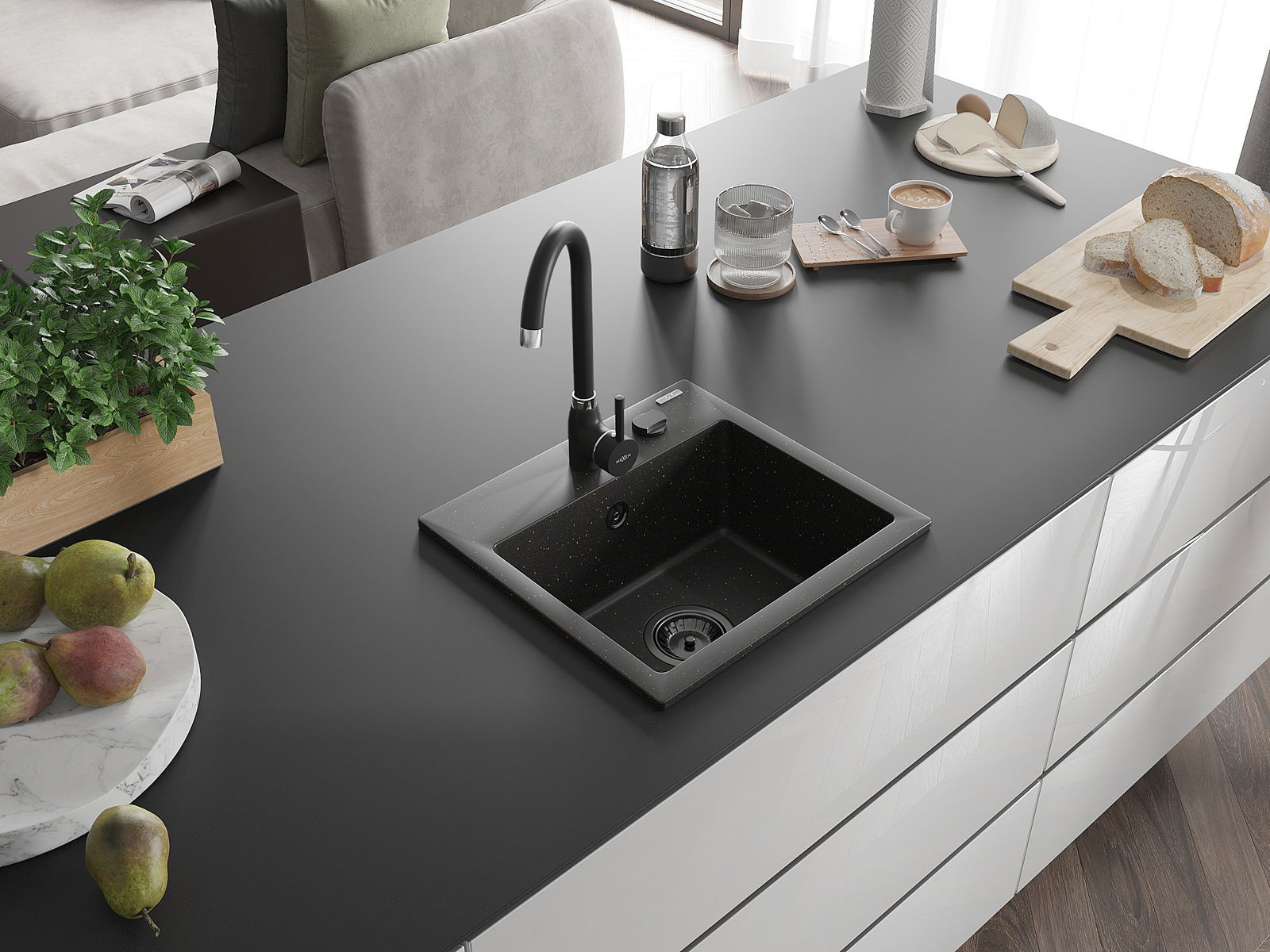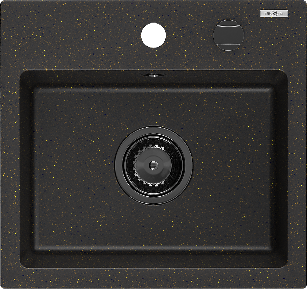 Mexen Milo granitinė vienos kameros kriauklė 435 x 410 mm, juoda/auksinė metalika, juodas sifonas - 6505441000-75-B