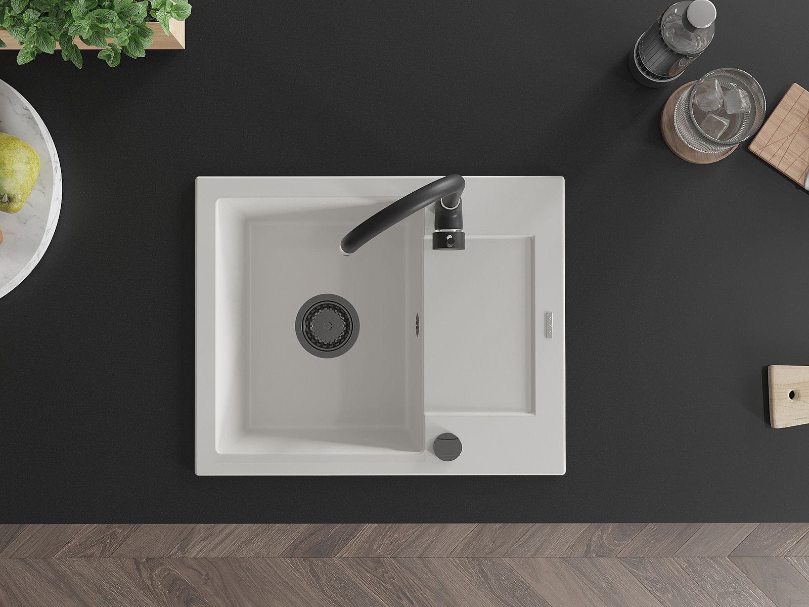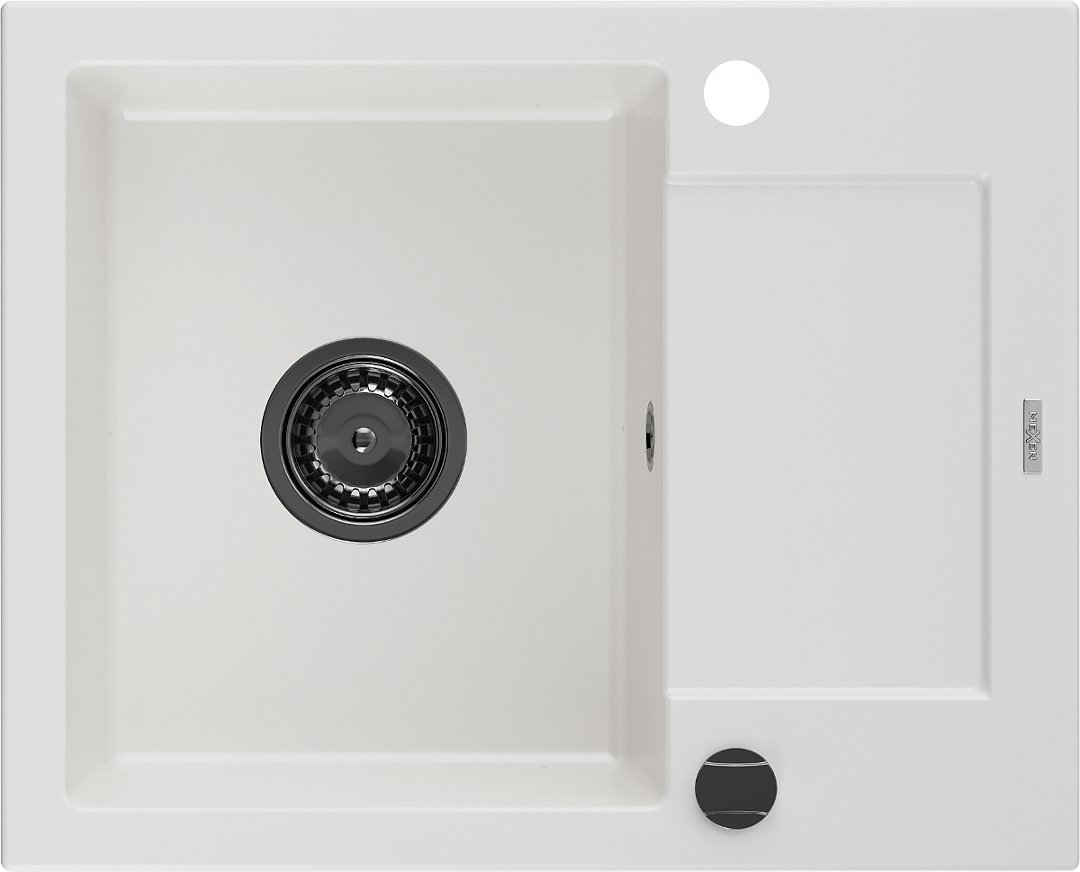 Mexen Enzo granitinė virtuvės kriauklė 1-dubeninė su lašintuvu 576 x 465 mm, balta, juodas sifonas - 6506571005-20-B