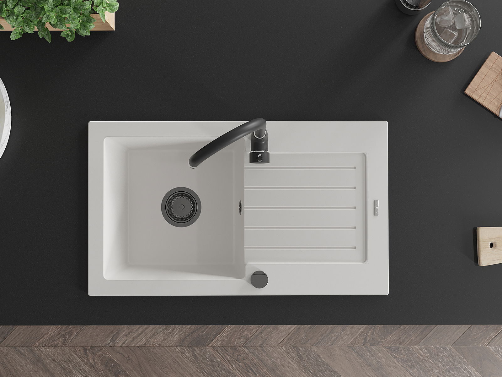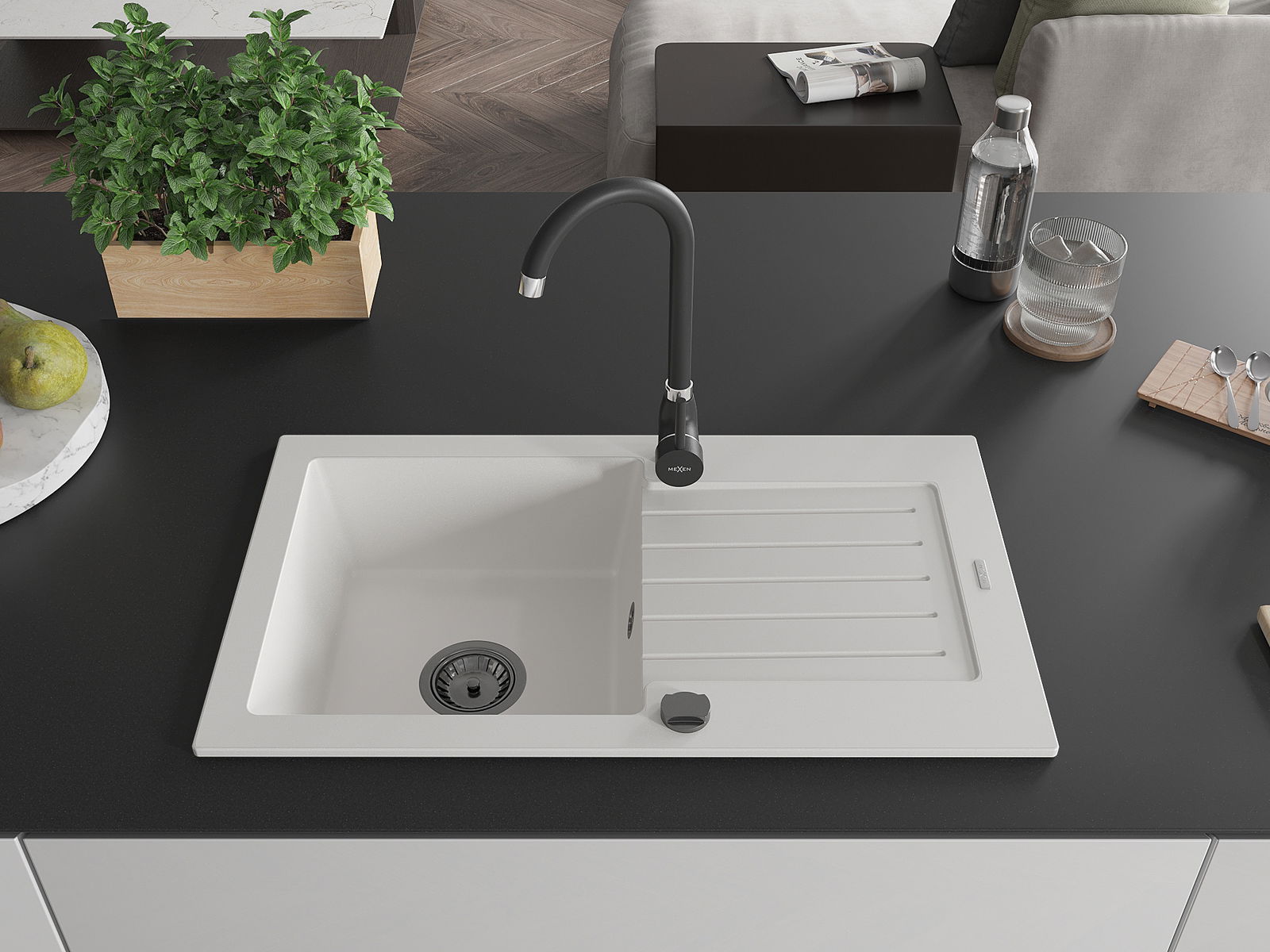 Mexen Pablo granitinė vienos kameros kriauklė su nutekėjimu 752 x 436 mm, balta, juodas sifonas - 6510751010-20-B