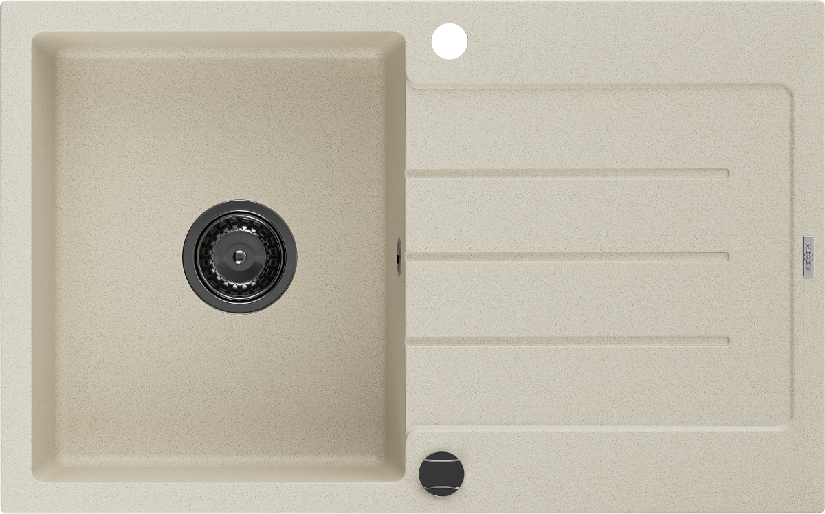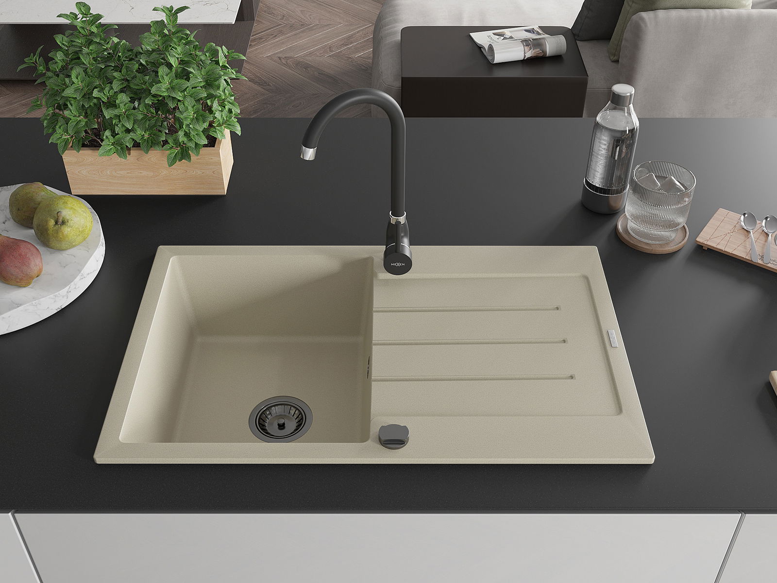 Mexen Bruno granitinė vienos kameros kriauklė su nutekamu 795 x 495 mm, smėlio, juodas sifonas - 6513791010-69-B