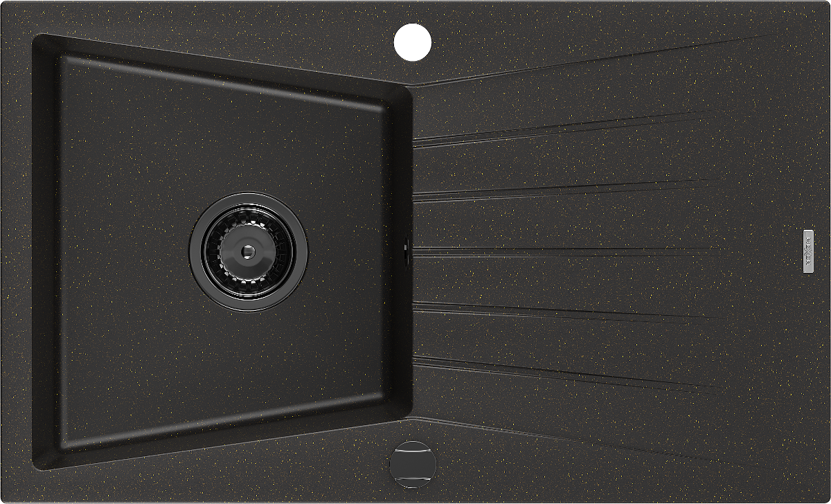 Mexen Cesar granitinė vienos kameros kriauklė su nuvarvėjimu 775 x 470 mm, juoda/auksinė metalo spalva, juodas sifonas