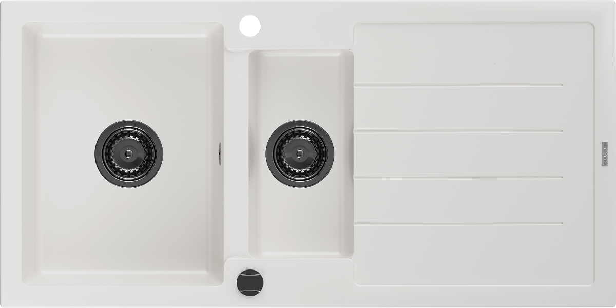 Mexen Andres granitinė 1,5 kamerų kriauklė su nutekėjimu 1000 x 500 mm, balta, juodas sifonas - 6515101510-20-B