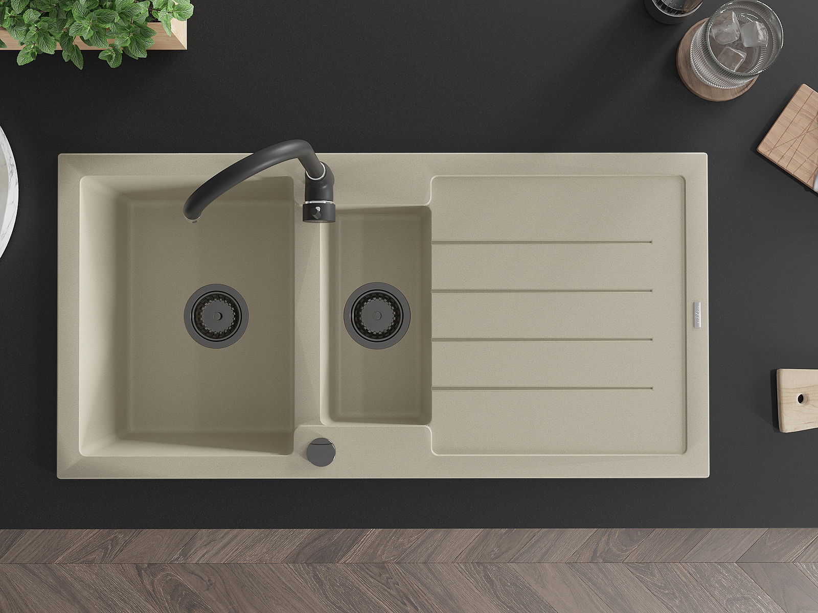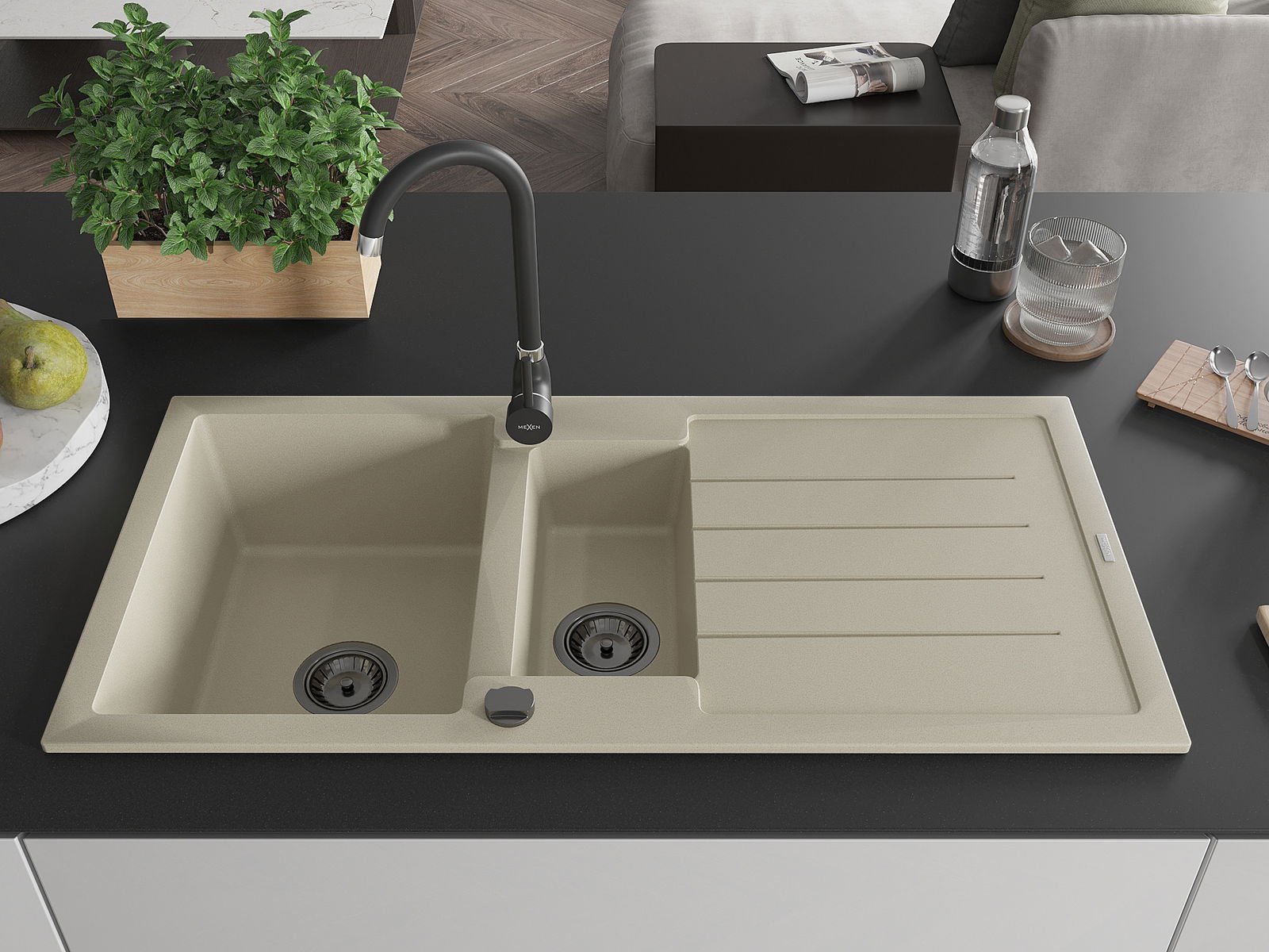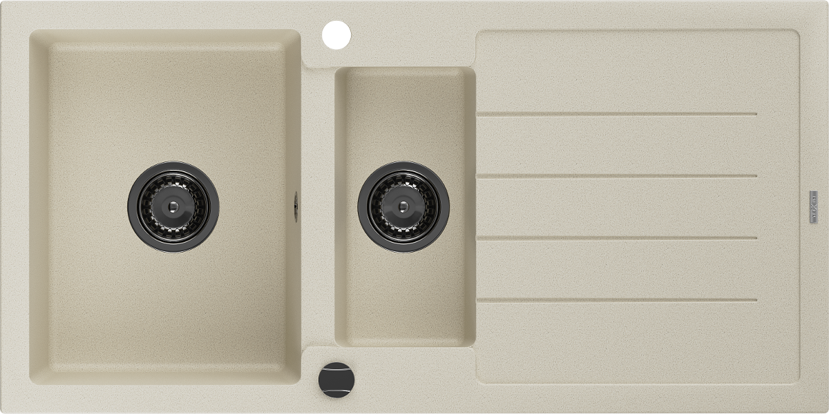 Mexen Andres granitinė dviejų skyrių kriauklė su lašeliu 1000 x 500 mm, smėlio spalvos, juodas sifonas - 6515101510-69-B
