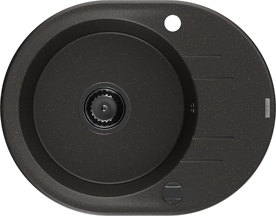 Mexen Kevin 1-dubeninė granito kriauklė su drenažu 586 x 458 mm, juoda/auksinė metalo spalva, juodas sifonas