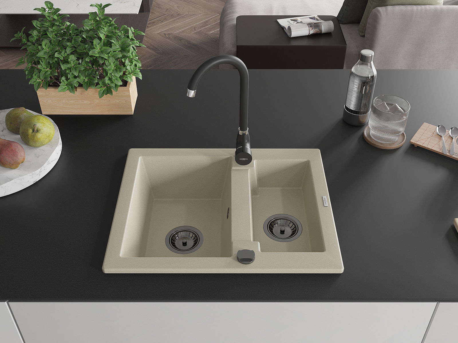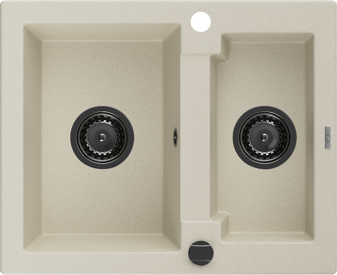 Mexen Carlos granitinis kriauklė 1,5 kameros 582 x 475 mm, smėlio spalvos, juodas sifonas - 6518581500-69-B