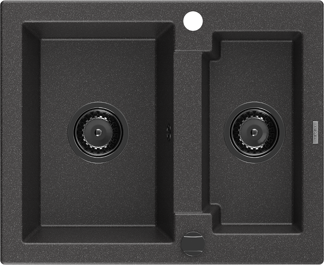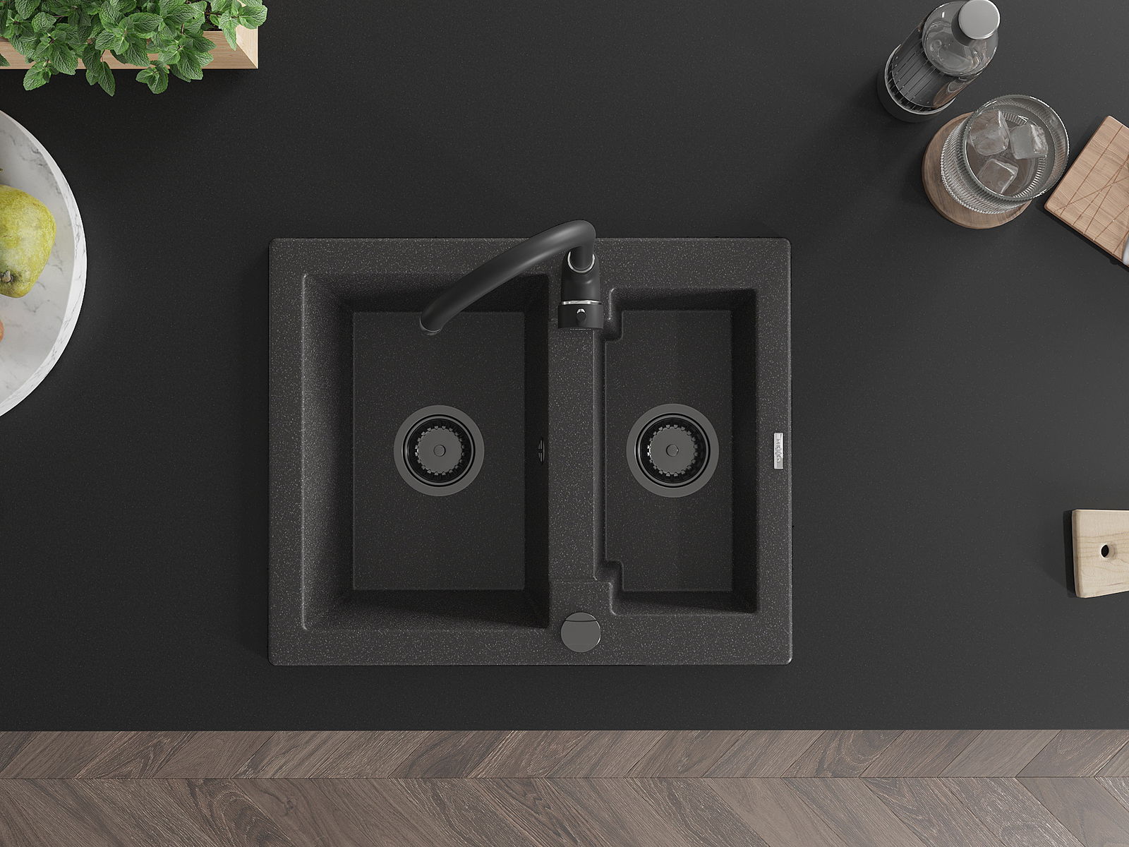 Mexen Carlos granitinė kriauklė 1,5 skylių 582 x 475 mm, juoda su dėmėmis, juodas sifonas - 6518581500-76-B