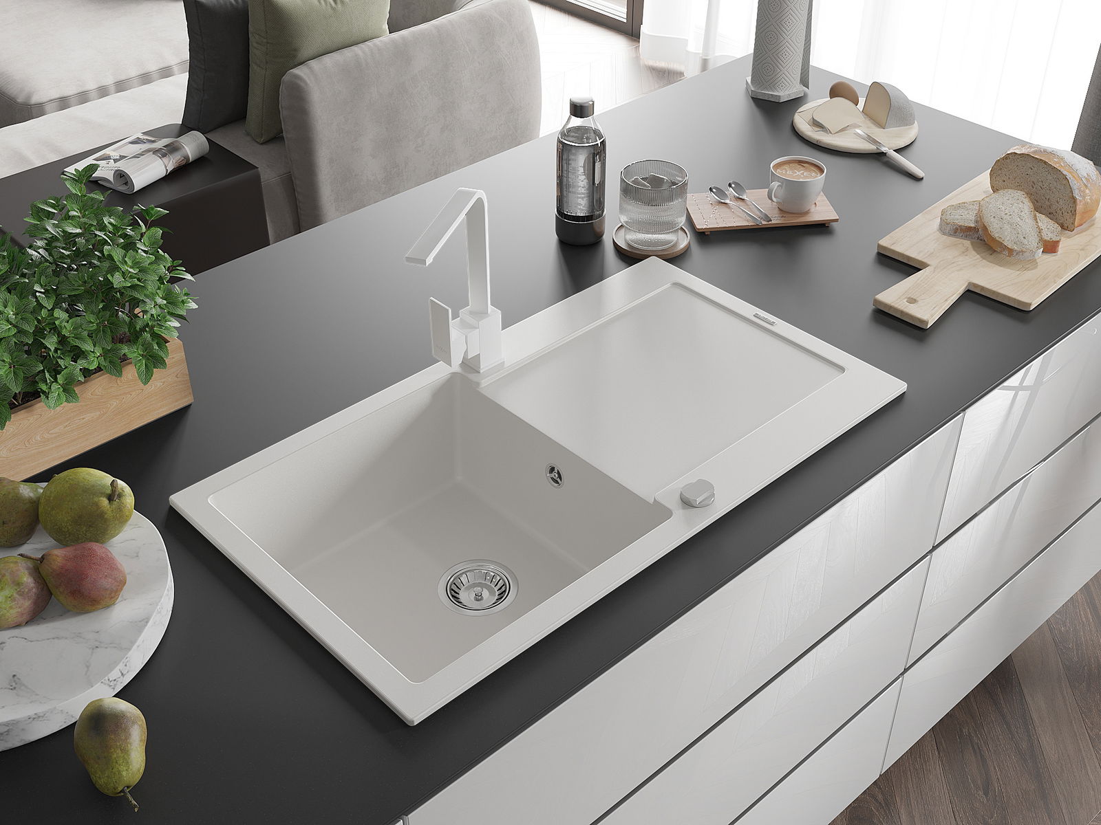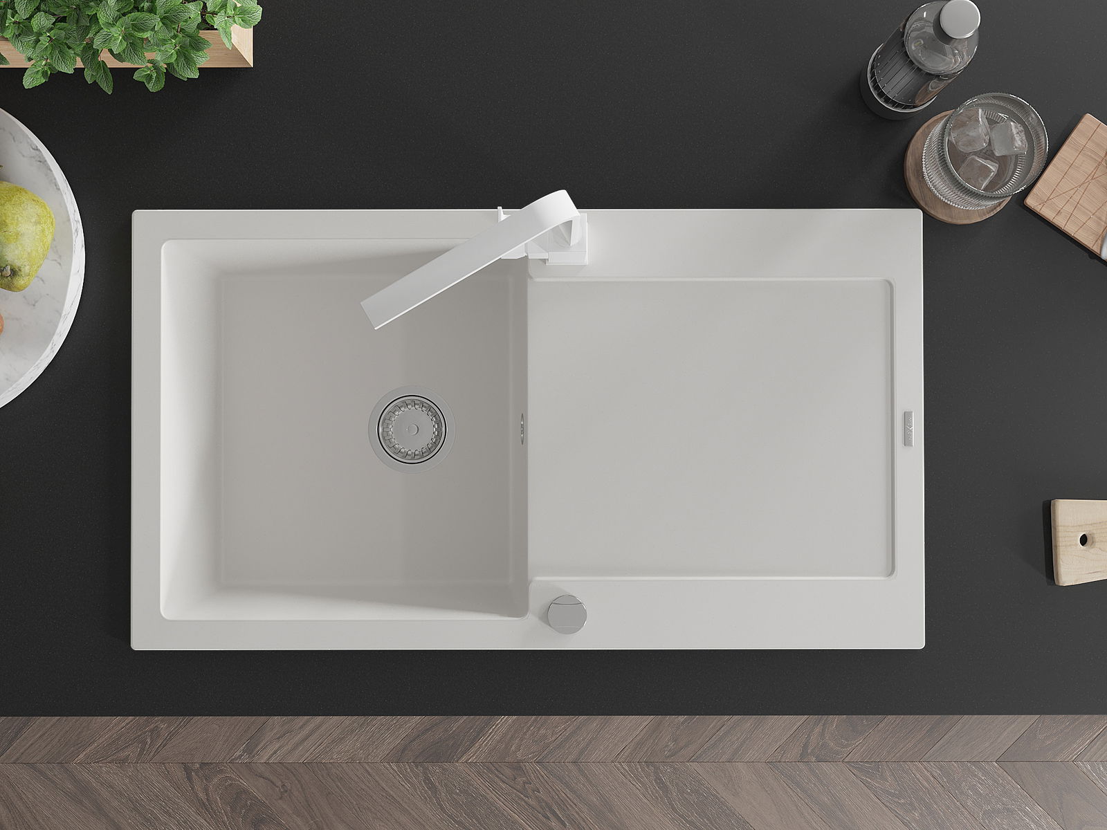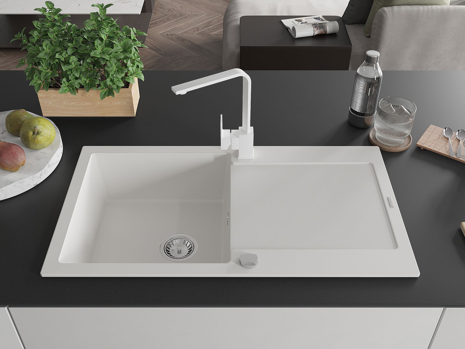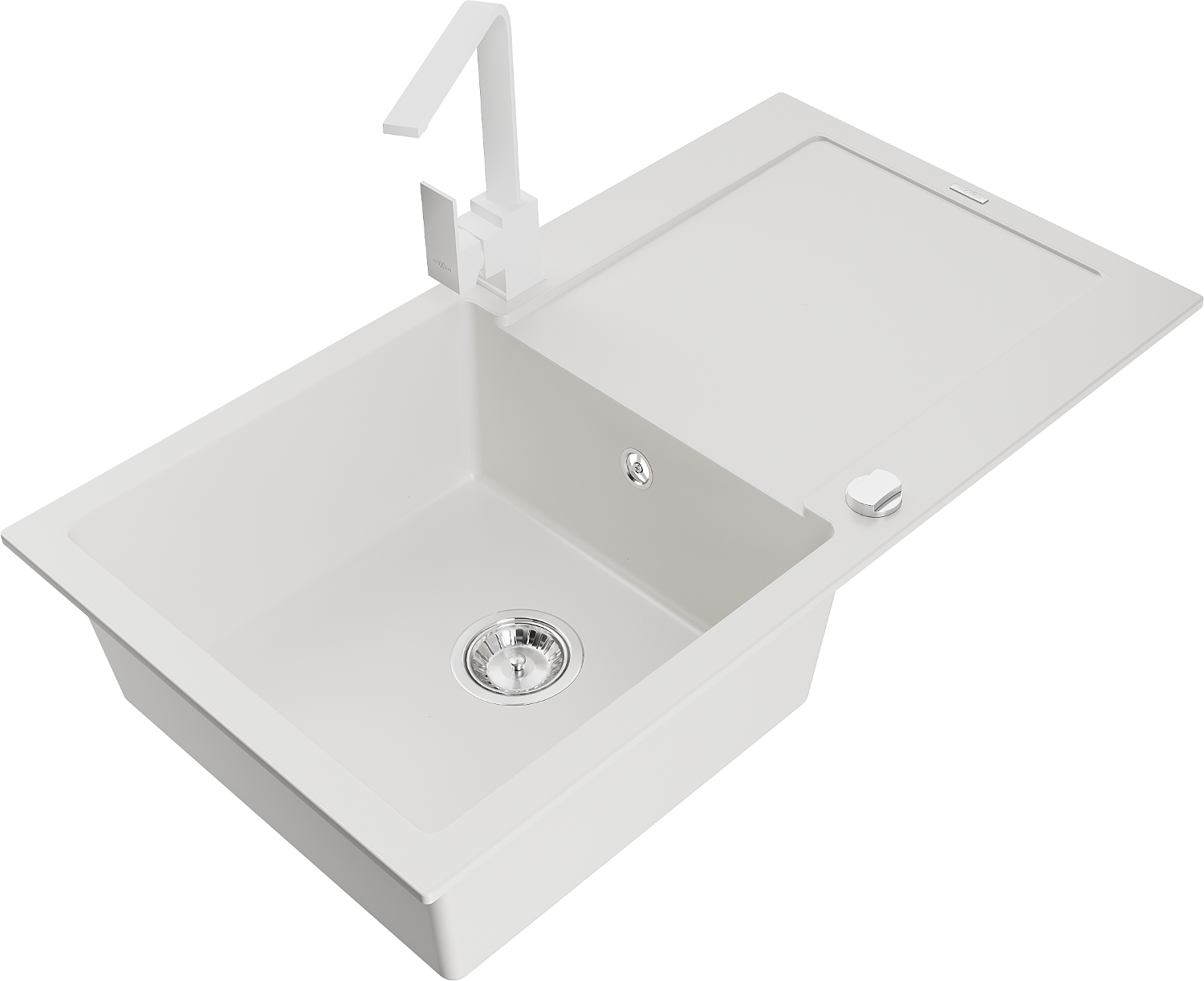 Mexen Leo 1-dubens granitinė plautuvė su nusausintuvu ir virtuviniu maišytuvu Rita, balta - 6501-20-670300-20