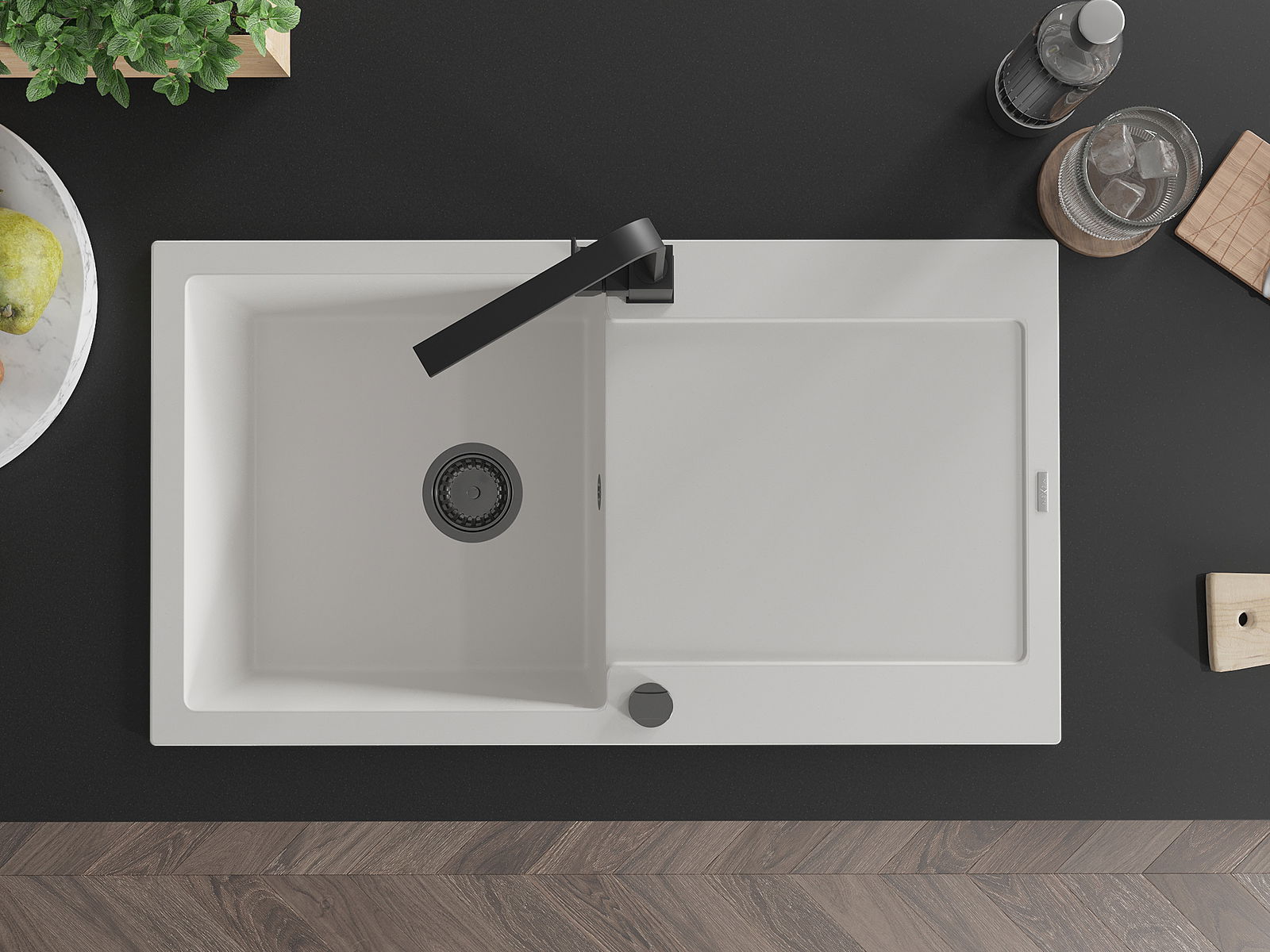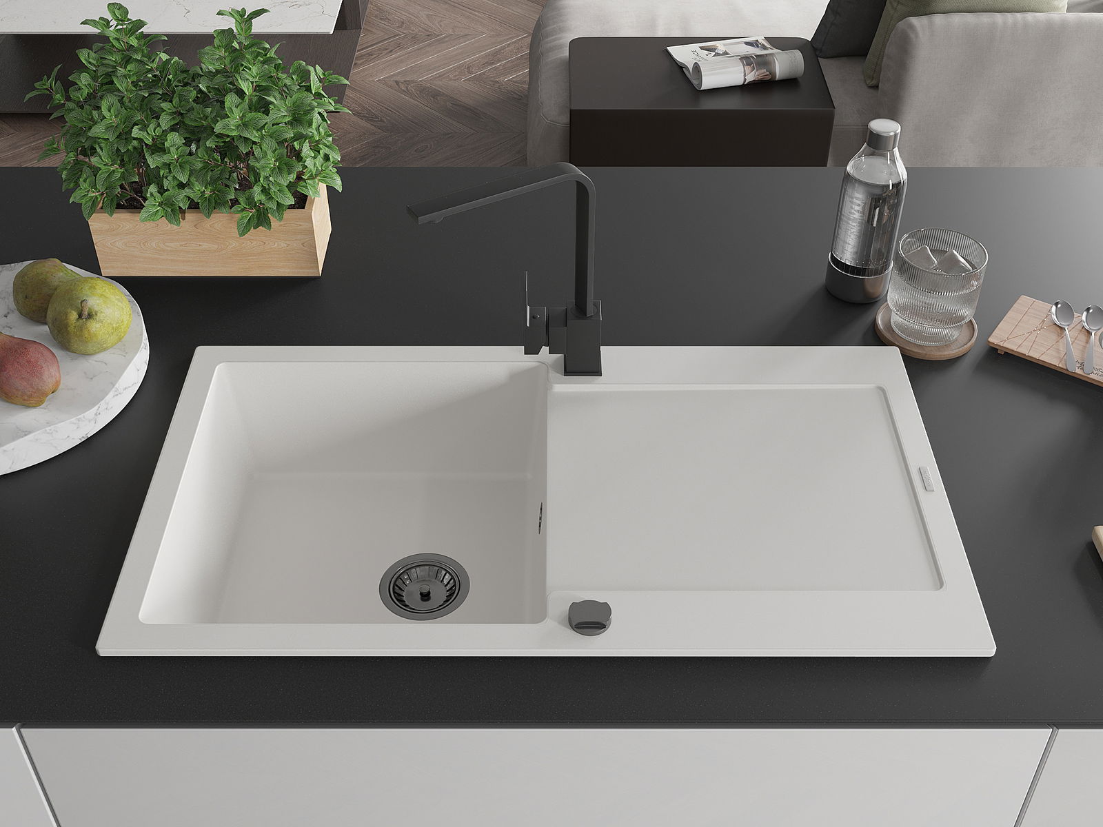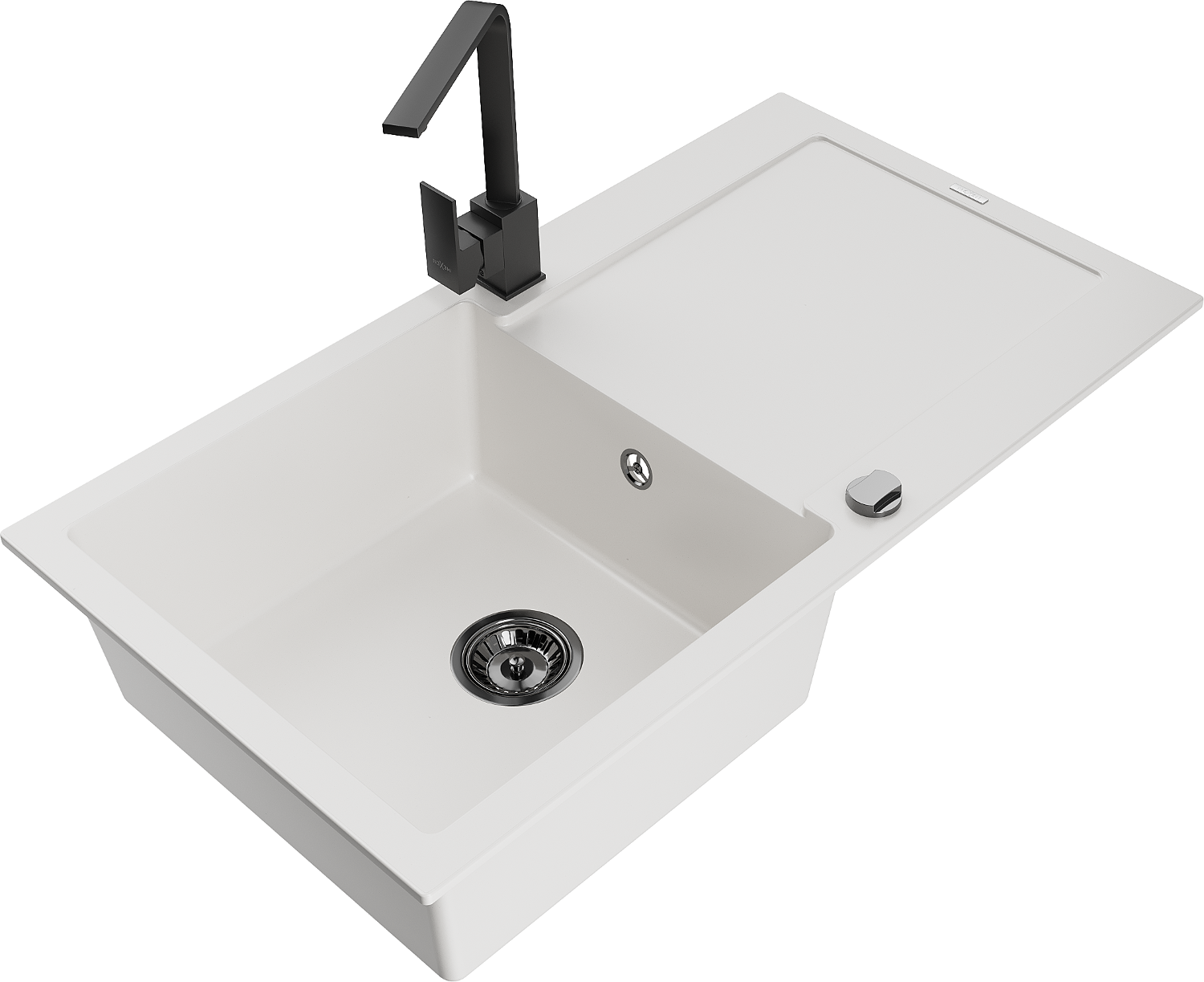 Mexen Leo granitinis virtuvinis kriauklė 1 skyrius su nuvarvėjimo lenta ir virtuviniu čiaupu Rita, baltas - 6501-20-670300-70