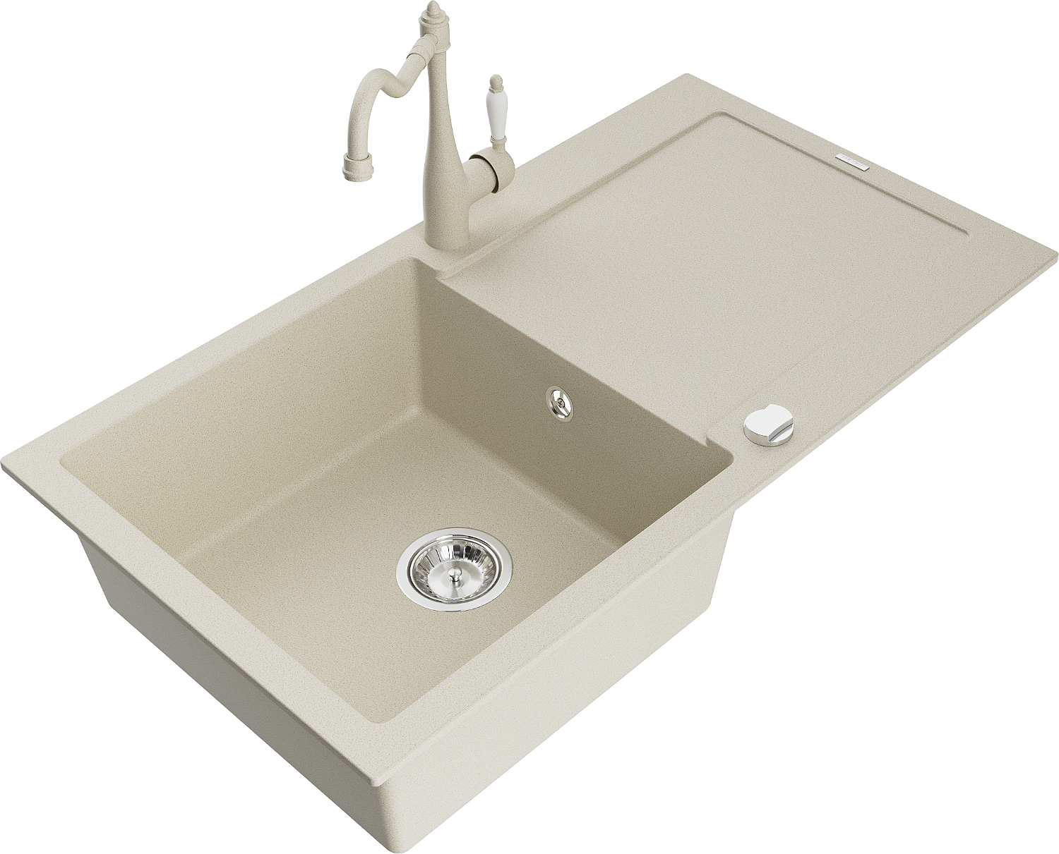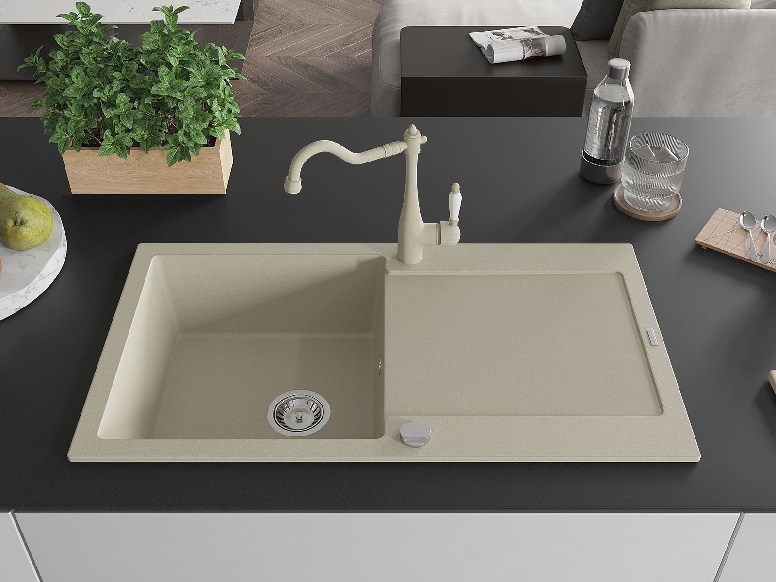 Mexen Leo granitinė vienos kameros kriauklė su nusausintuvu ir virtuviniu maišytuvu Carla, smėlio spalvos