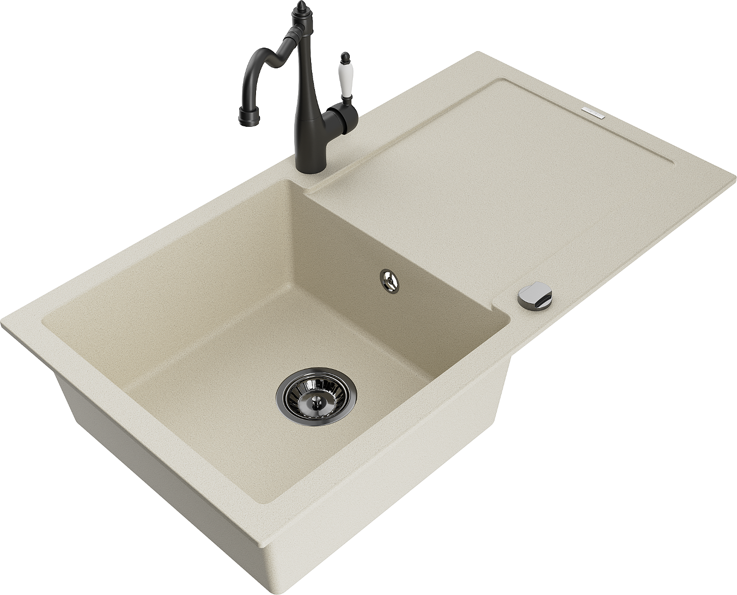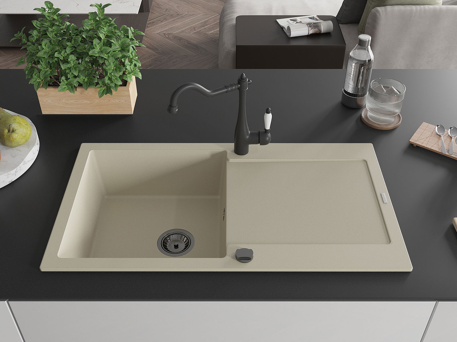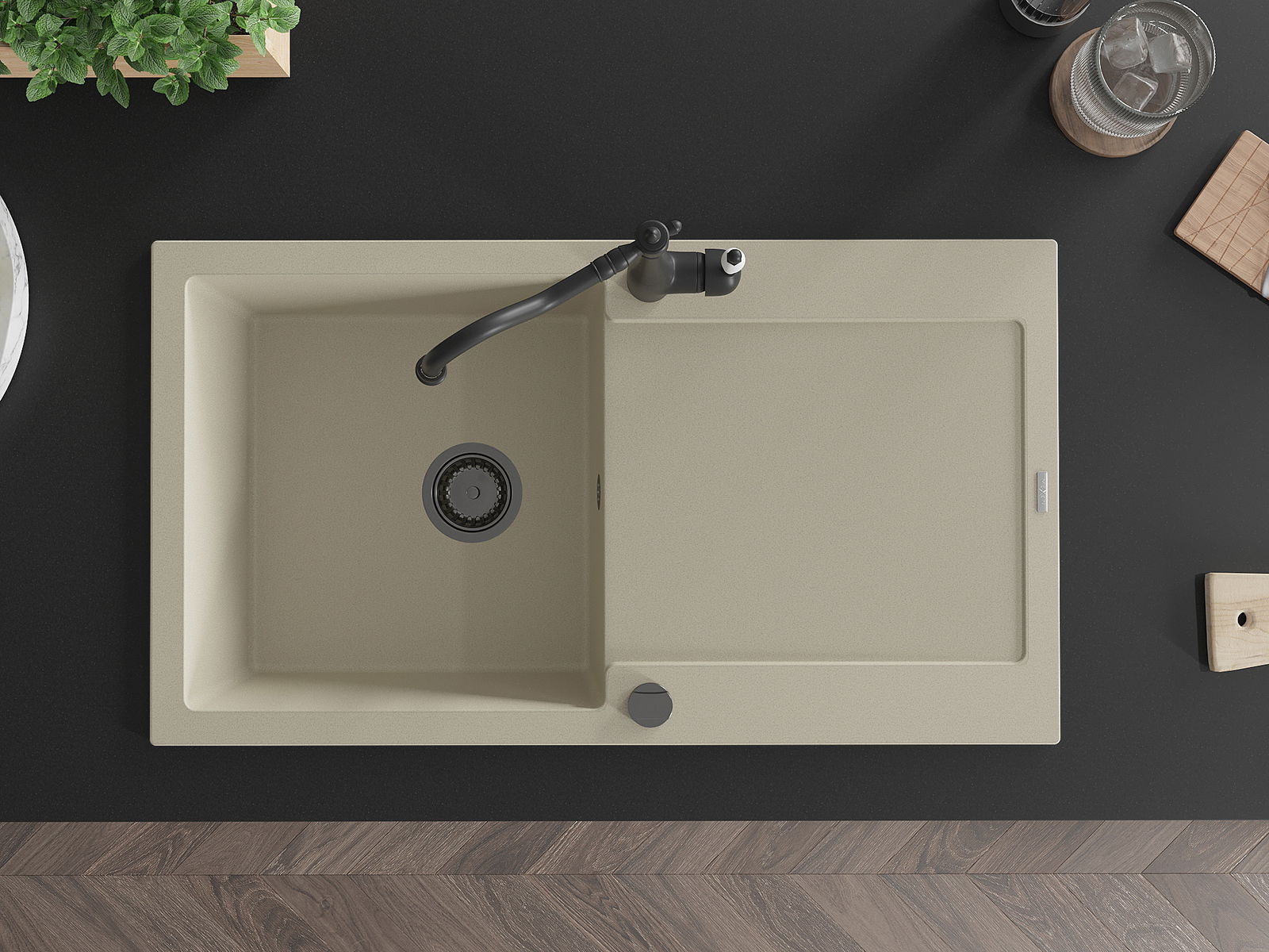 Mexen Leo granitinis vienos plautuvės kriauklė su nusausintuvu ir virtuviniu čiaupu Carla, smėlinis - 6501-69-670700-70