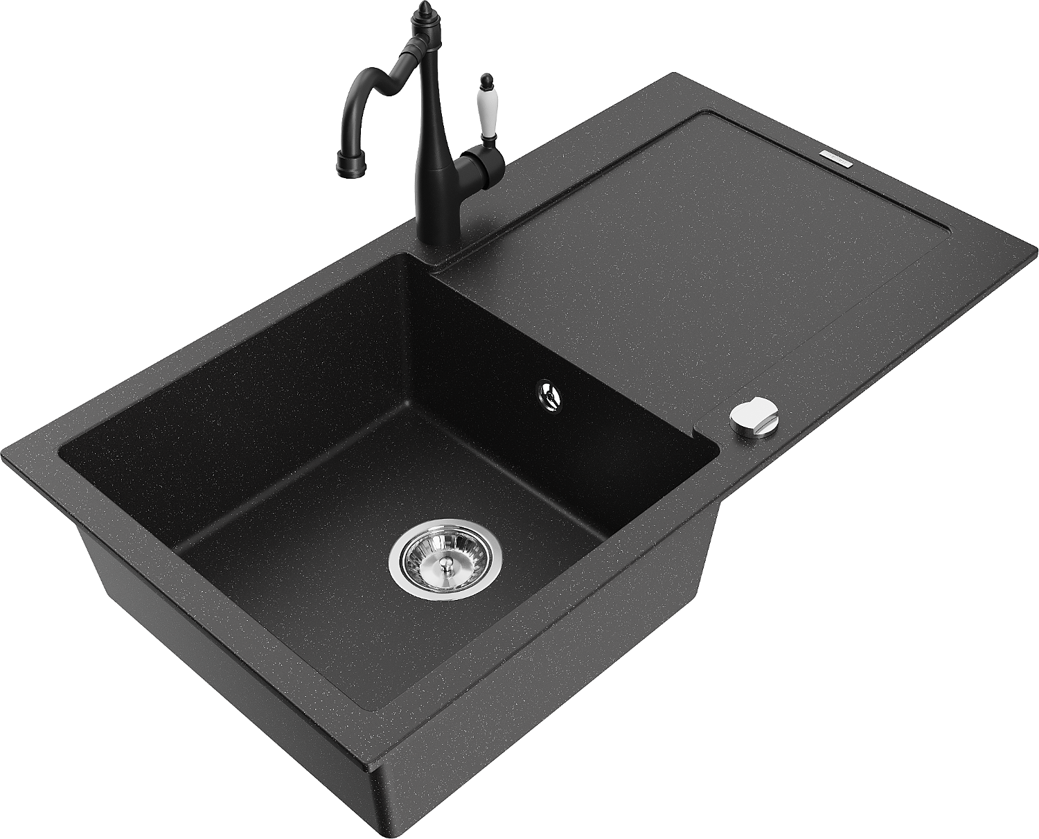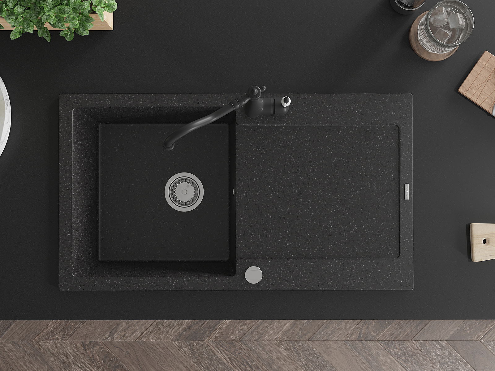 Mexen Leo granitinė vienos plautuvės kriauklė su nuvarvėtu ir virtuviniu maišytuvu Carla, juoda/sidabrinis metalikas