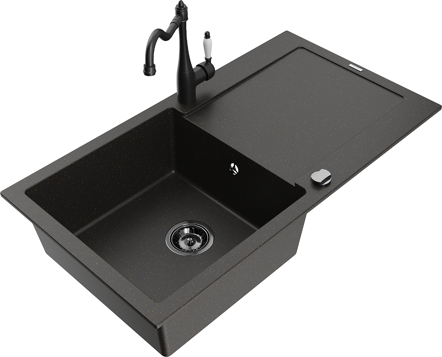 Mexen Leo granito plautuvė 1 skyrelio su drenažu ir virtuviniu maišytuvu Carla, juoda/auksinė metalika - 6501-75-670700-70-B