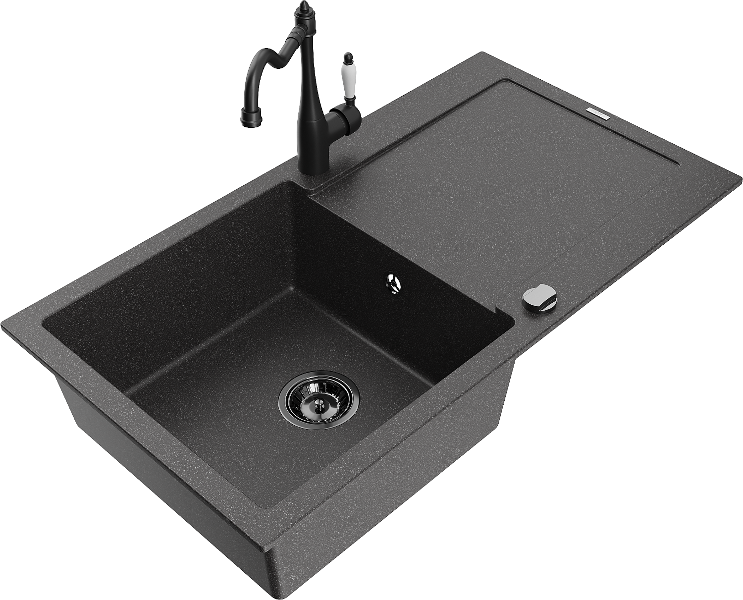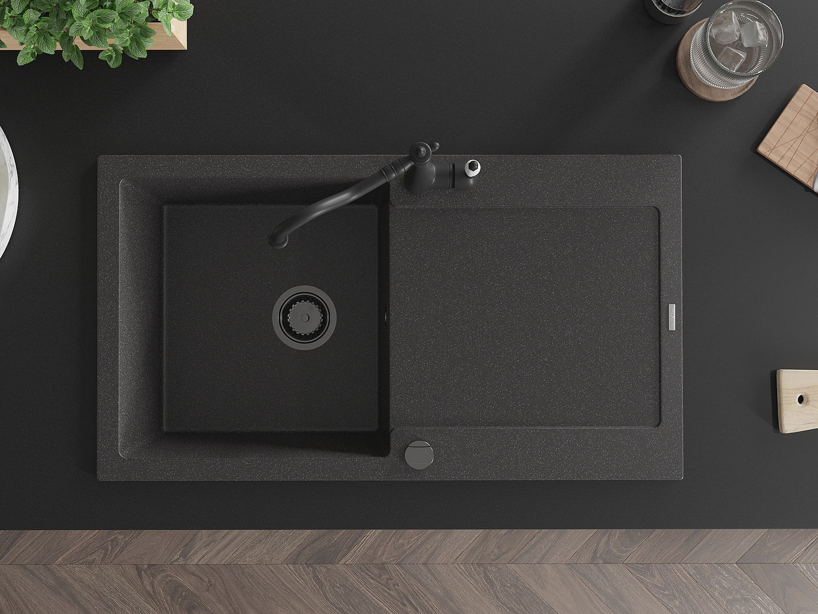 Mexen Leo granito plautuvė su viena kamera, nuotekamu ir virtuvės čiaupu Carla, juoda su dėmėmis - 6501-76-670700-70-B