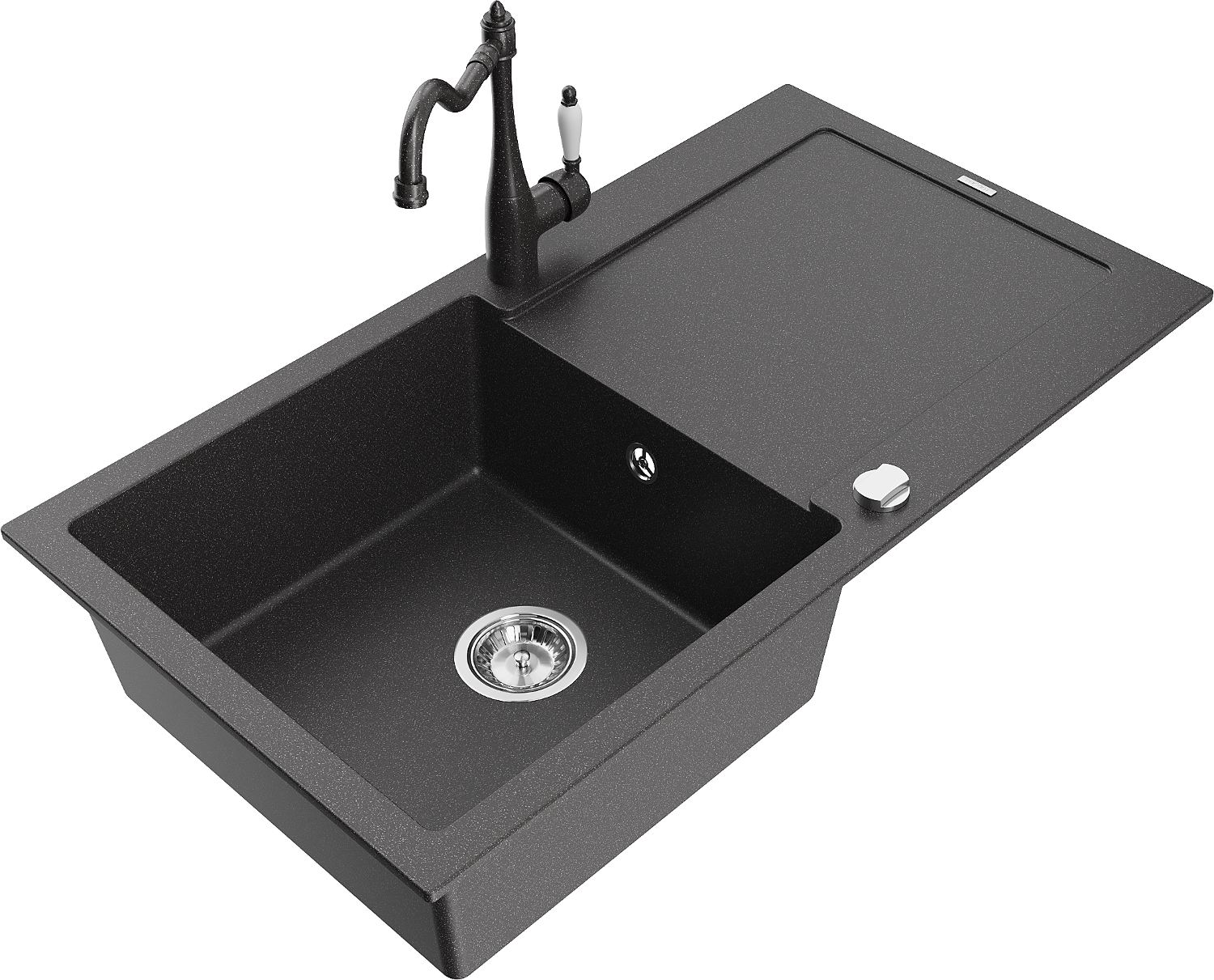 Mexen Leo granitinė vienos kameros kriauklė su nuvarvėjimo lentynėle ir Carla virtuviniu maišytuvu, išmargintas juodai