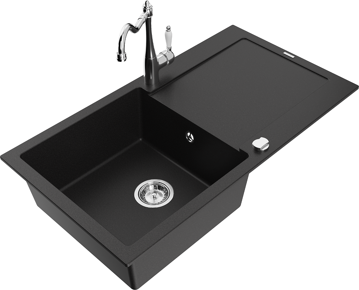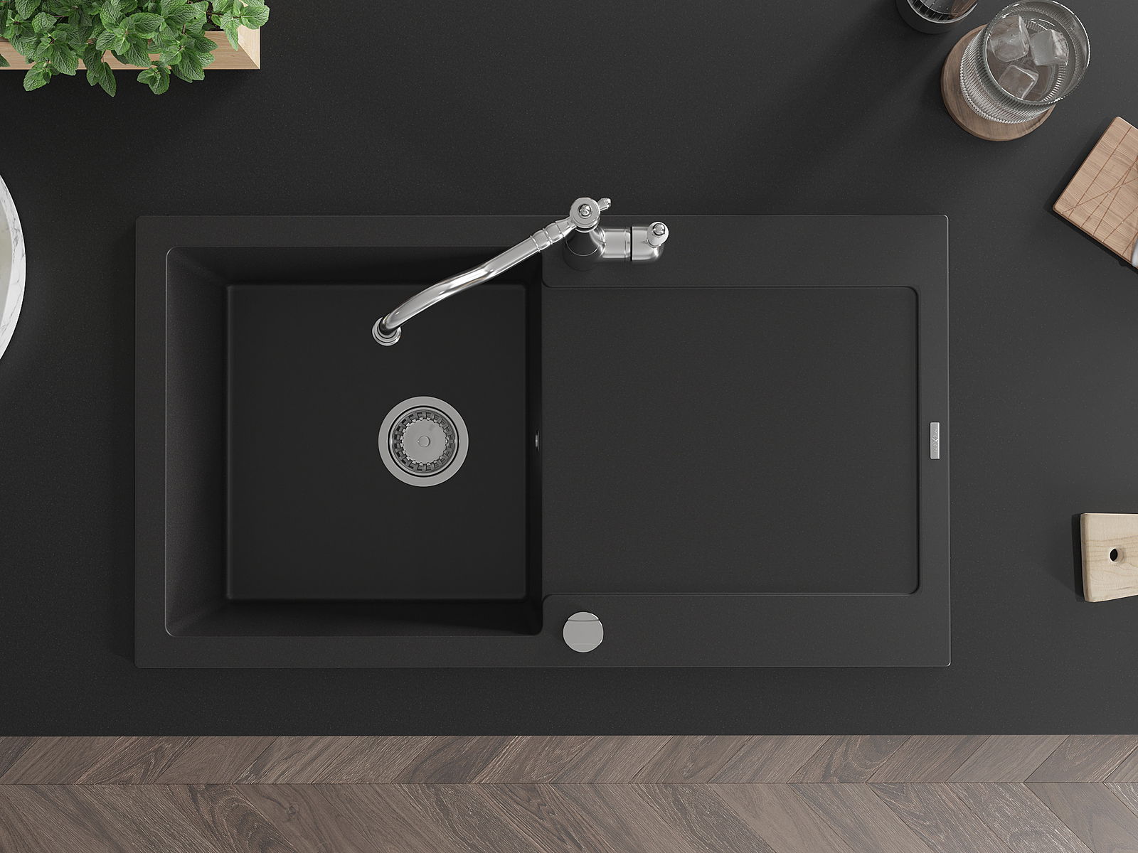 Mexen Leo granitinė kriauklė su vienu dubeniu ir nutekėjimu bei virtuviniu maišytuvu Carla, juoda - 6501-77-670700-00