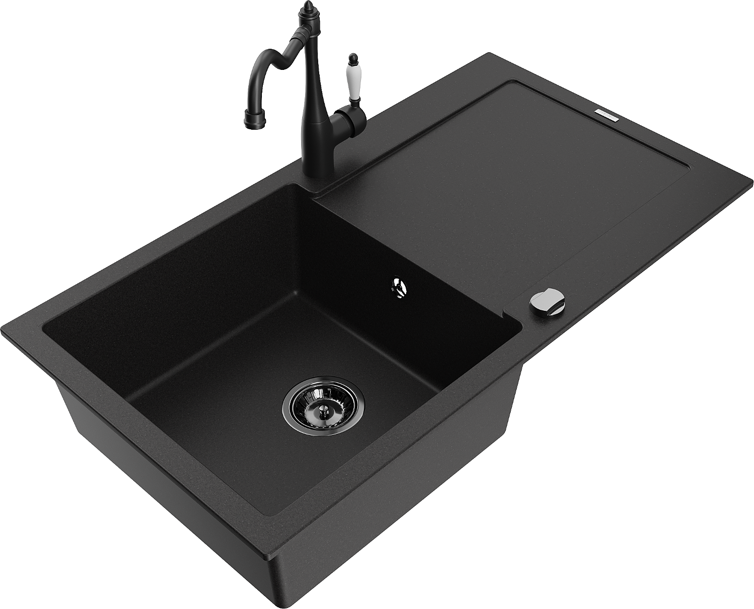 Mexen Leo granito plautuvė su viena kamera, nusausintuvu ir Carla virtuviniu maišytuvu, juoda - 6501-77-670700-70-B