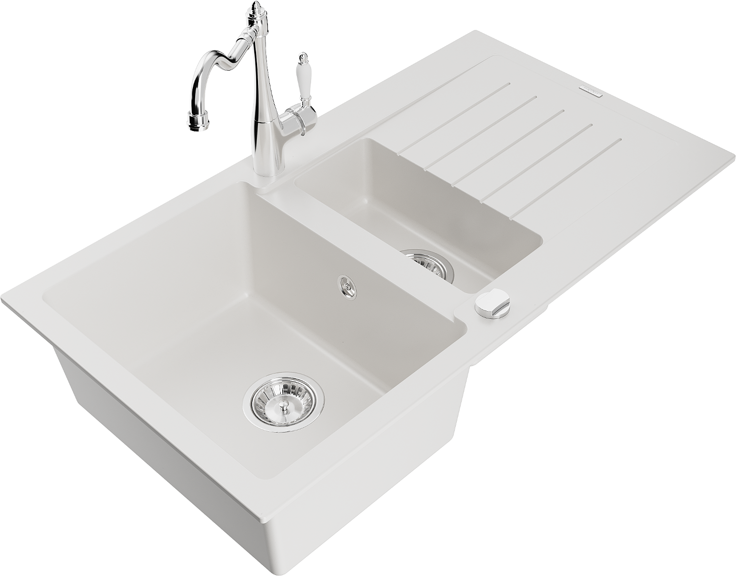 Mexen Matias granitinė kriauklė 1,5 kamerų su nutekamu ir virtuviniu maišytuvu Carla, balta - 6502-20-670700-00