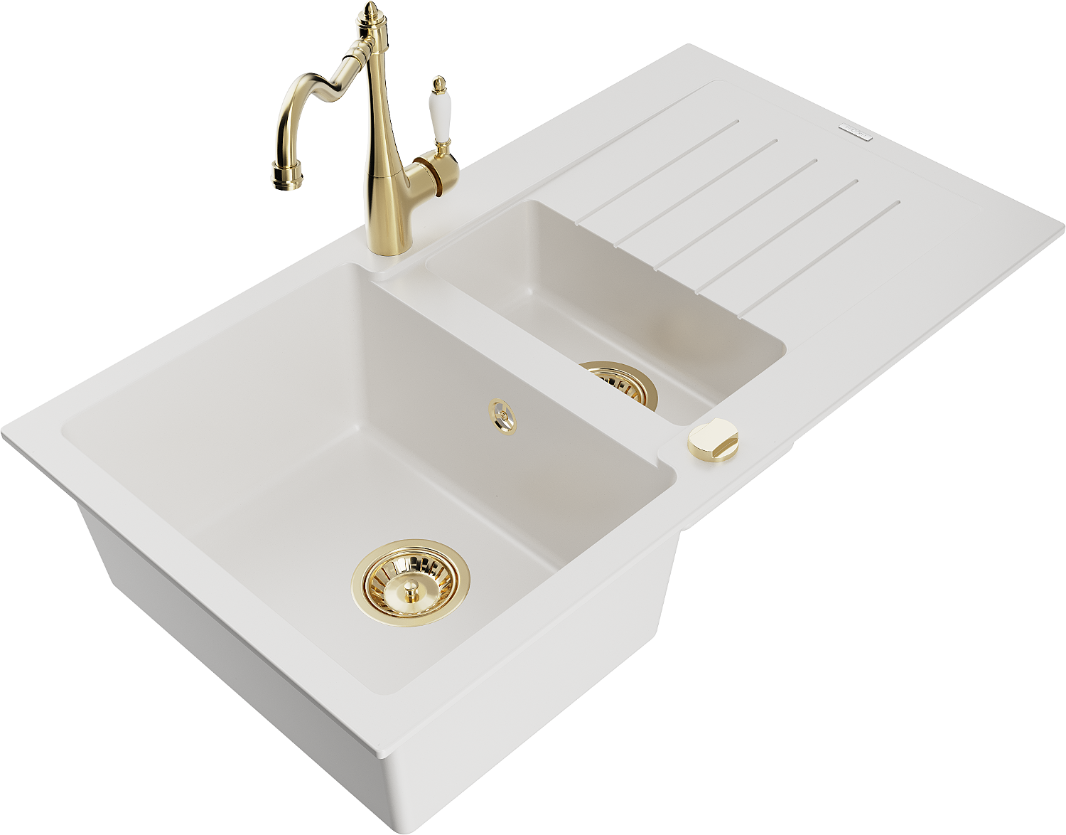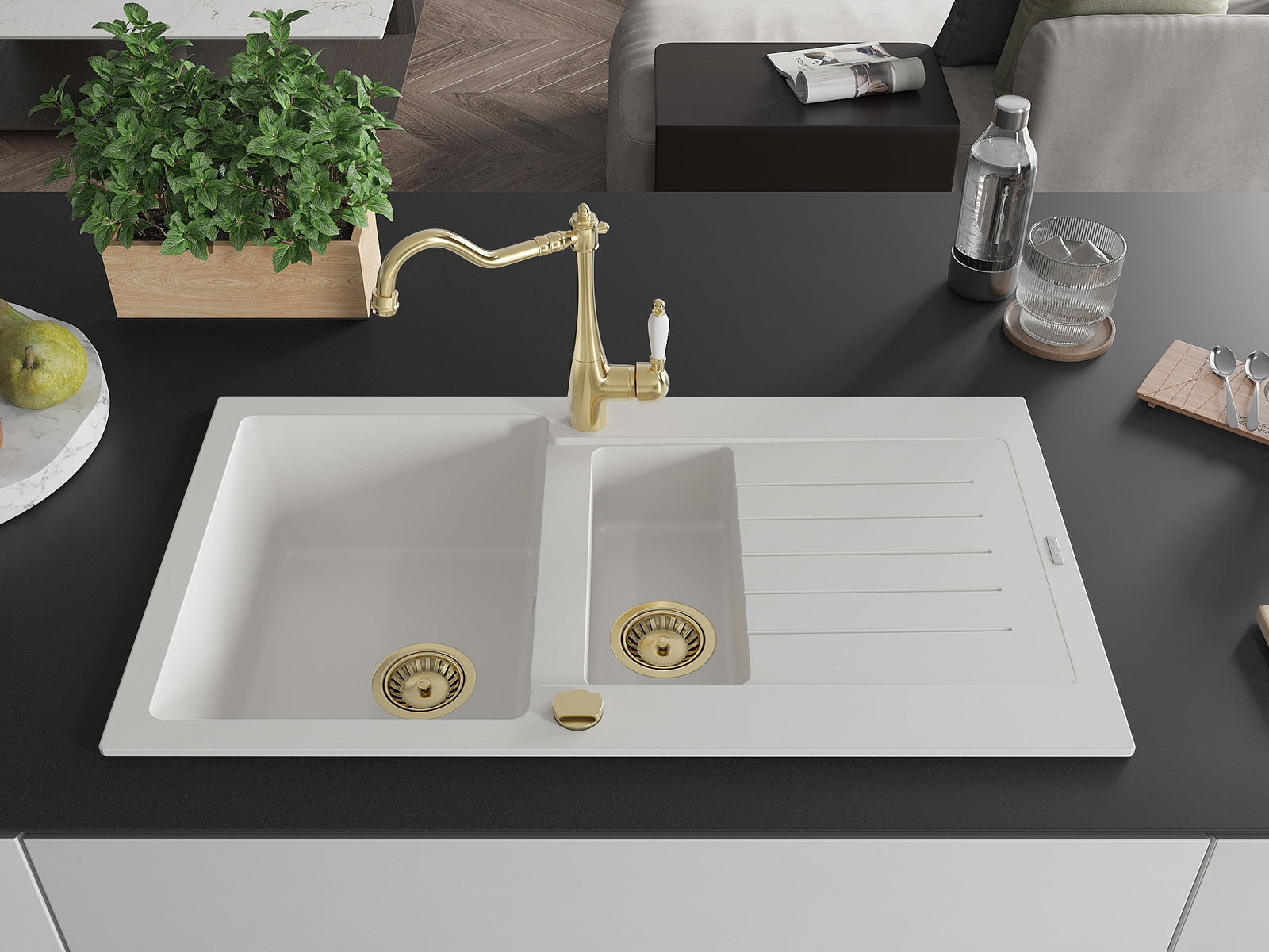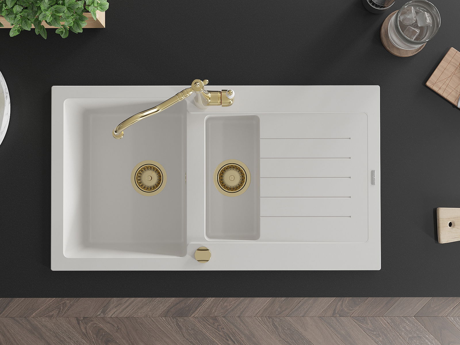 Mexen Matias granito plautuvė 1,5 kamerų su nutekėjimo zona ir virtuviniu maišytuvu Carla, balta - 6502-20-670700-50