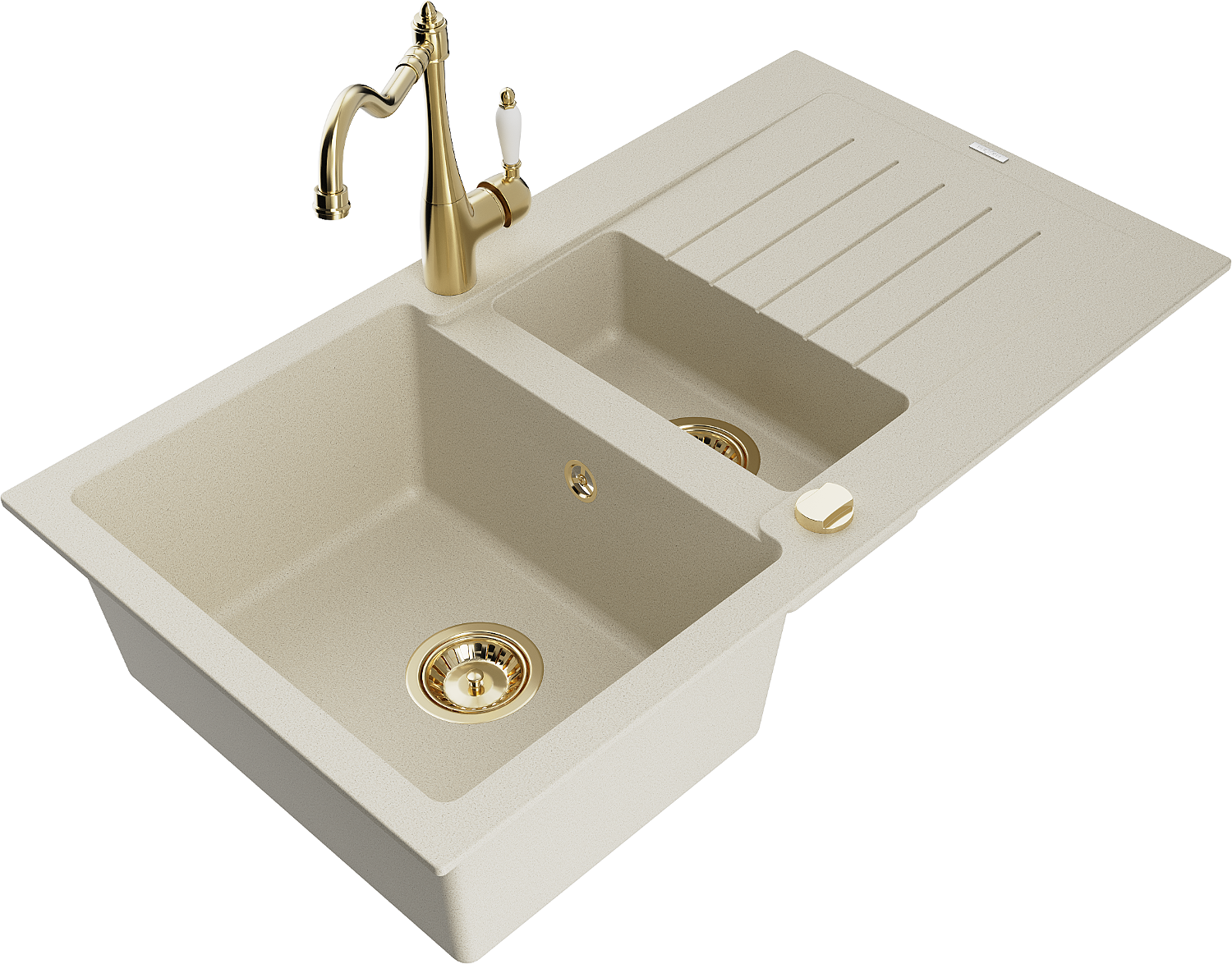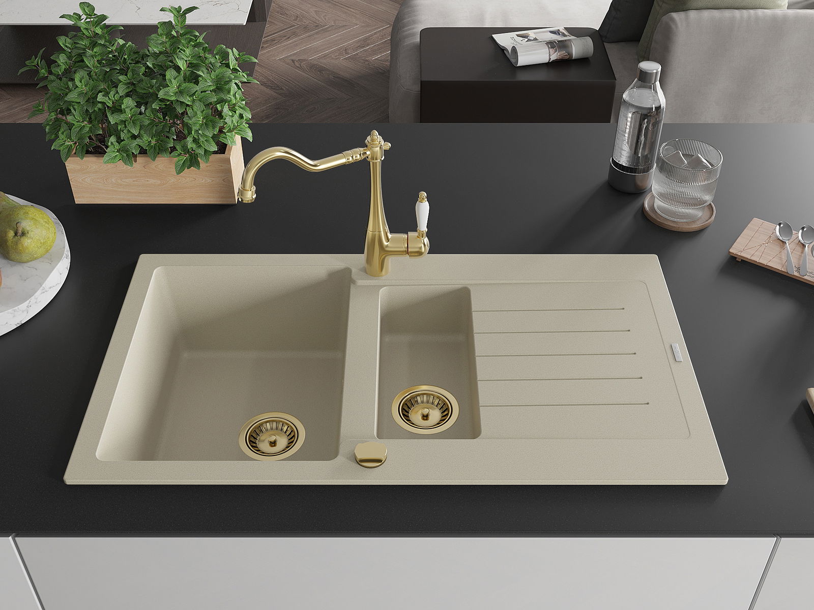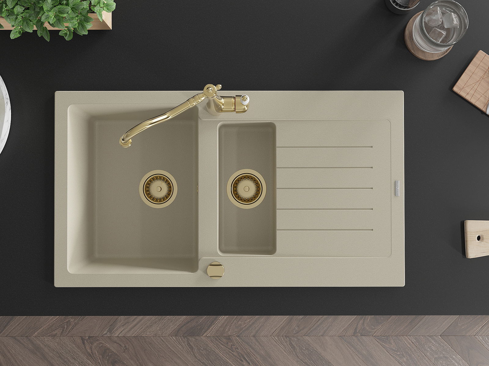 Mexen Matias granitinė 1,5 dubens plautuvė su nuvarvėjimo zona ir virtuviniu maišytuvu Carla, smėlio spalvos