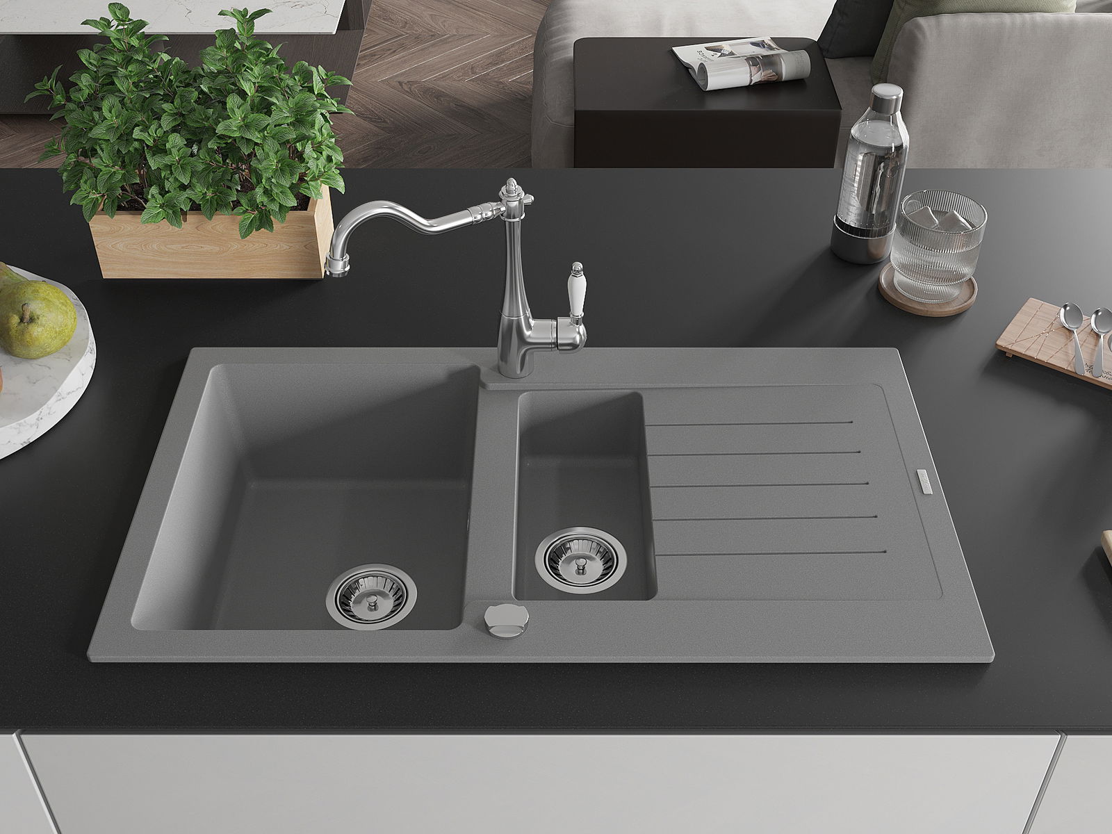 Mexen Matias granitinė 1,5 sekcijų plautuvė su nutekėjimu ir virtuviniu maišytuvu Carla, pilka - 6502-71-670700-00