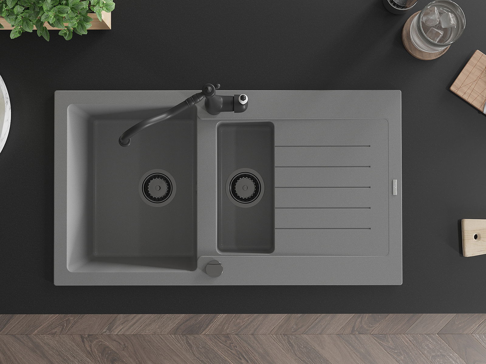 Kriauklė turi 2 iš anksto frezuotas skyles, kurių skersmuo yra 35 mm, skirtas savarankiškam išmušimui. Jas galima naudoti, pavyzdžiui, skysčio dozatoriaus montavimui, kuris pašalins plastikinių butelių buvimą virtuvėje ir suteiks jai elegantišką apdailą.