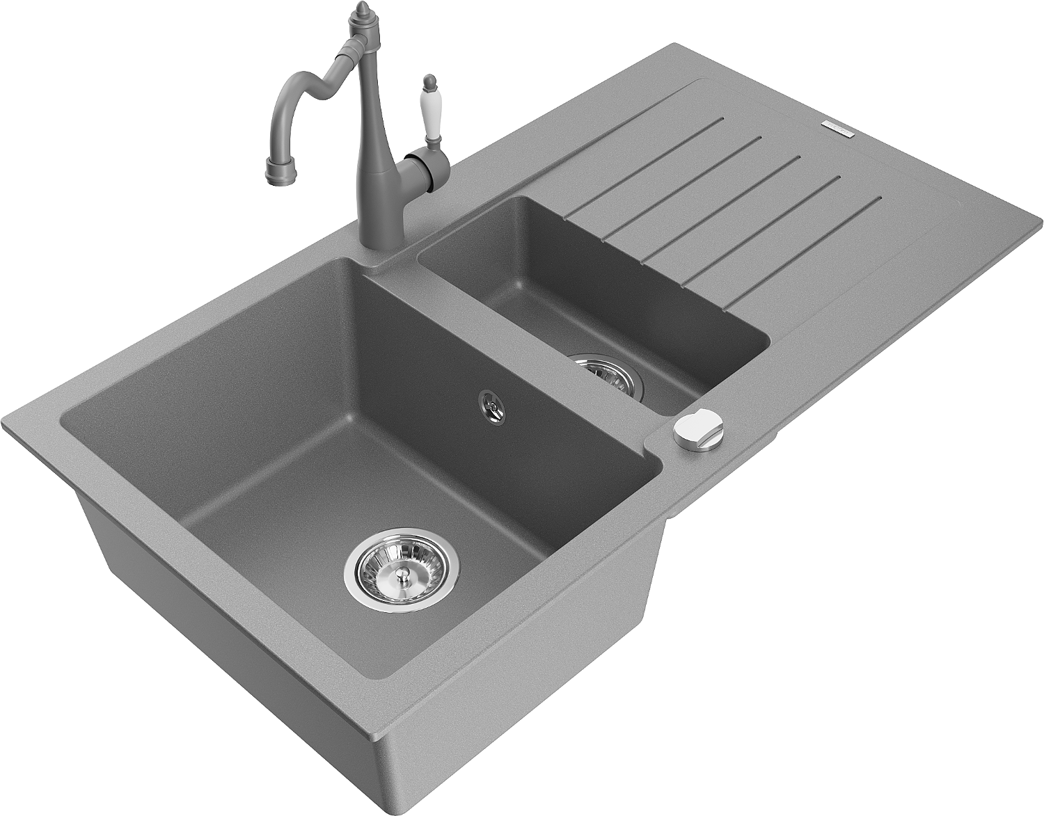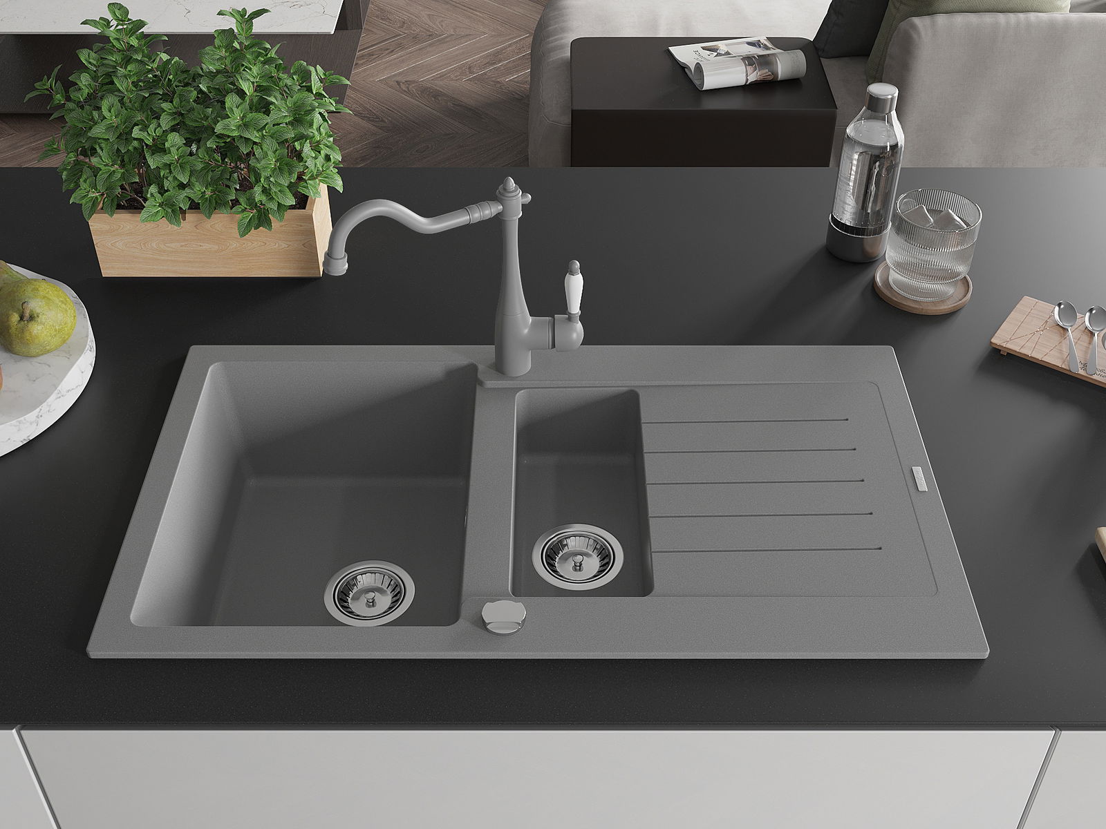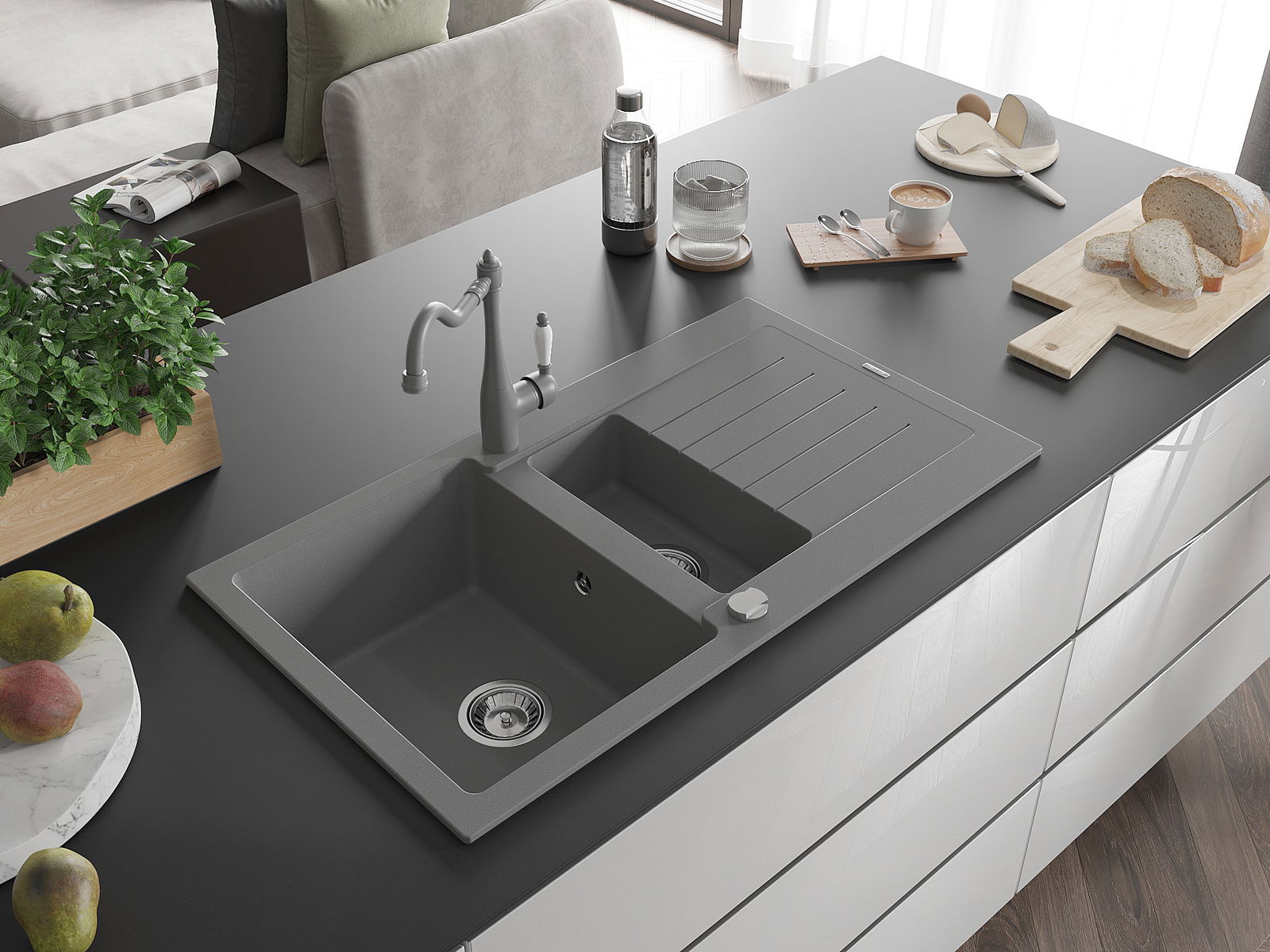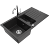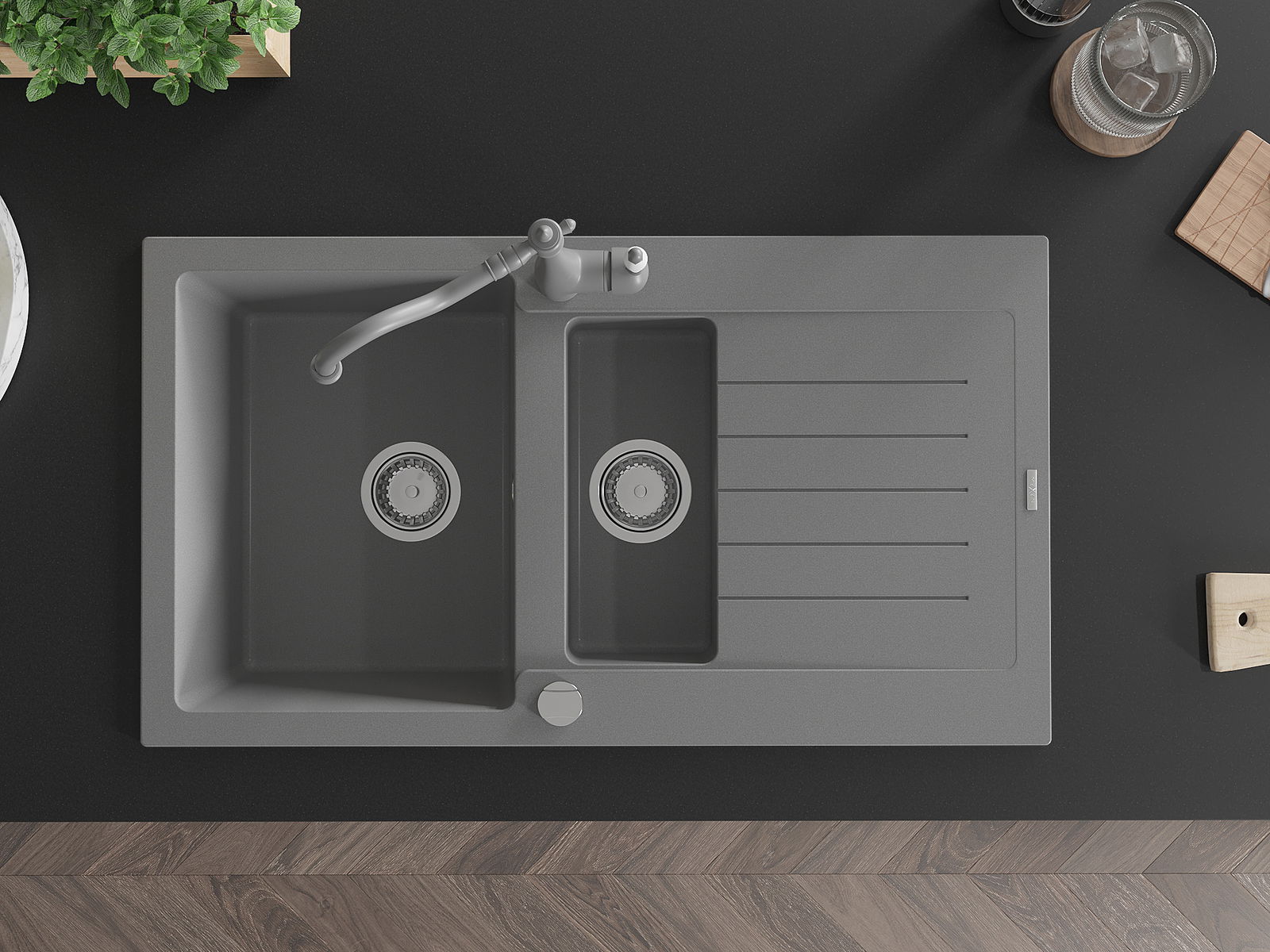 Mexen Matias granitinė 1,5 skylių kriauklė su nutekėjimo lenta ir virtuviniu maišytuvu Carla, pilka - 6502-71-670700-71