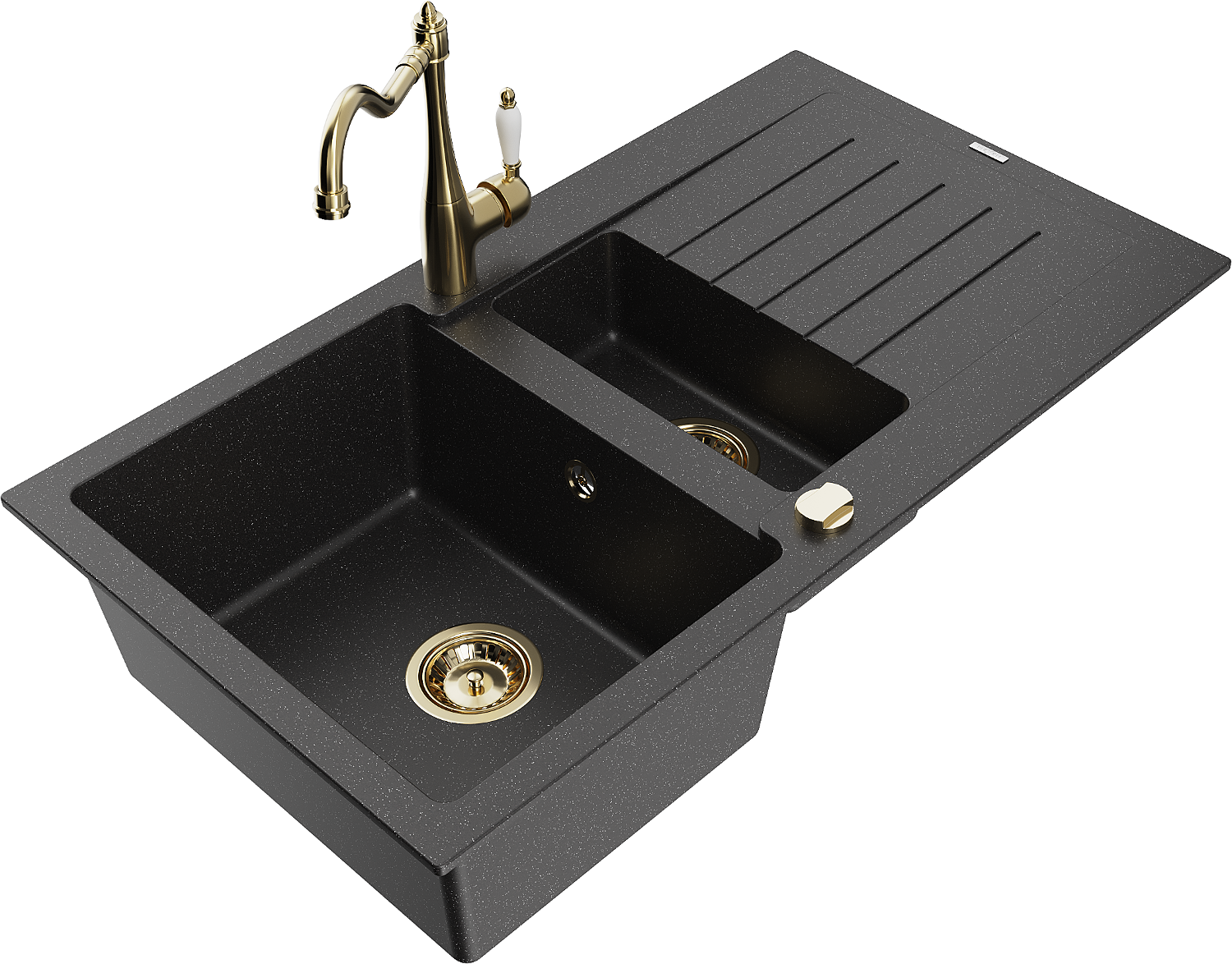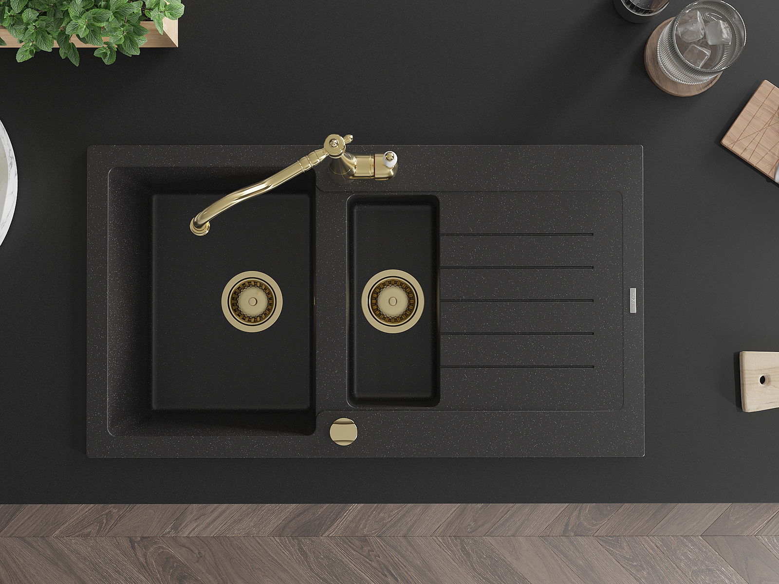 Mexen Matias granitinė 1,5 kambario plautuvė su nuvarvėtu ir virtuvės maišytuvu Carla juoda/sidabrinis metaliko