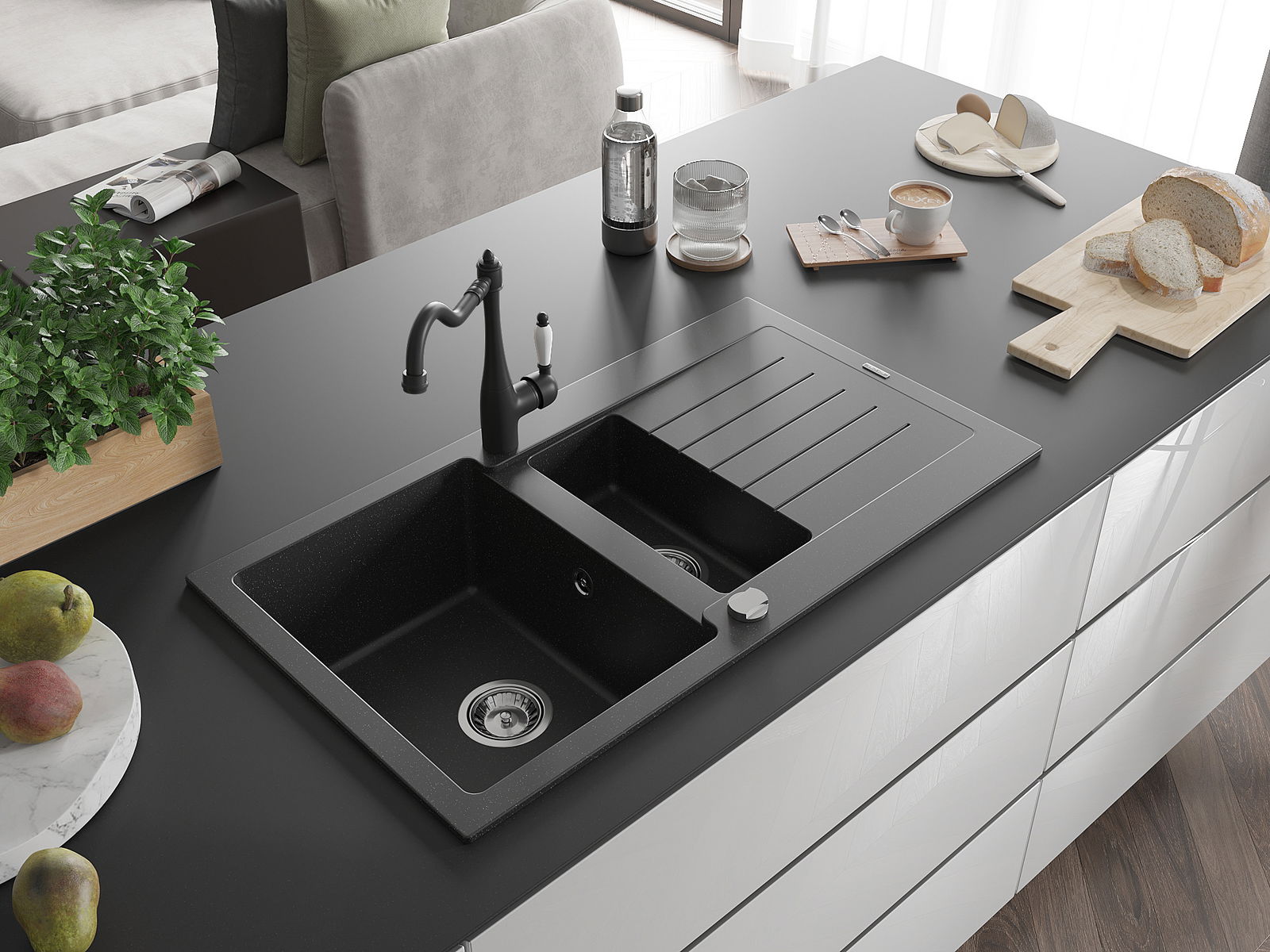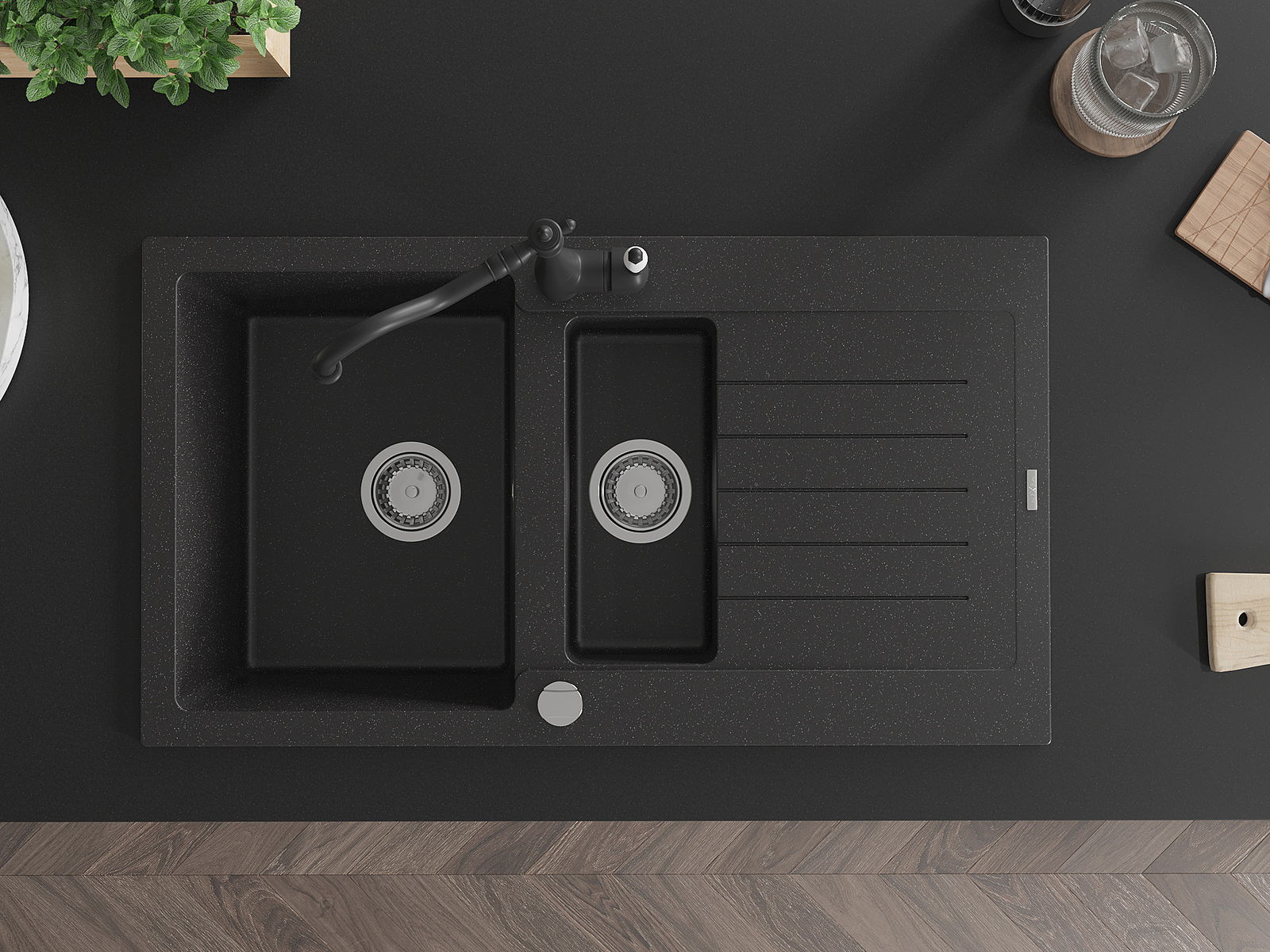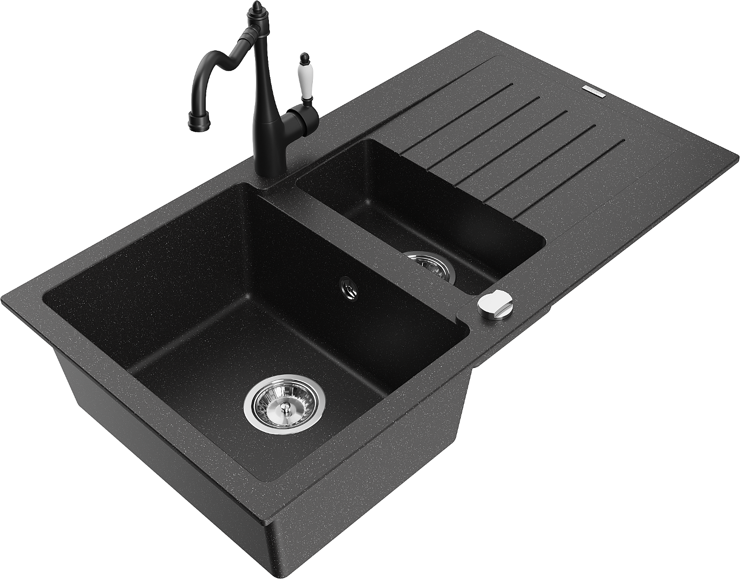 Mexen Matias granitinė 1,5 skyrelio plautuvė su nuvarvėjimo skydu ir virtuvine maišytuve Carla juoda/sidabrinė metalik
