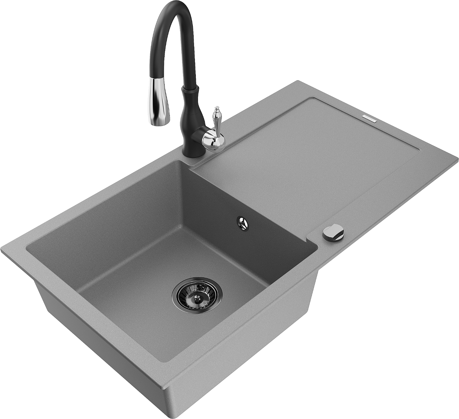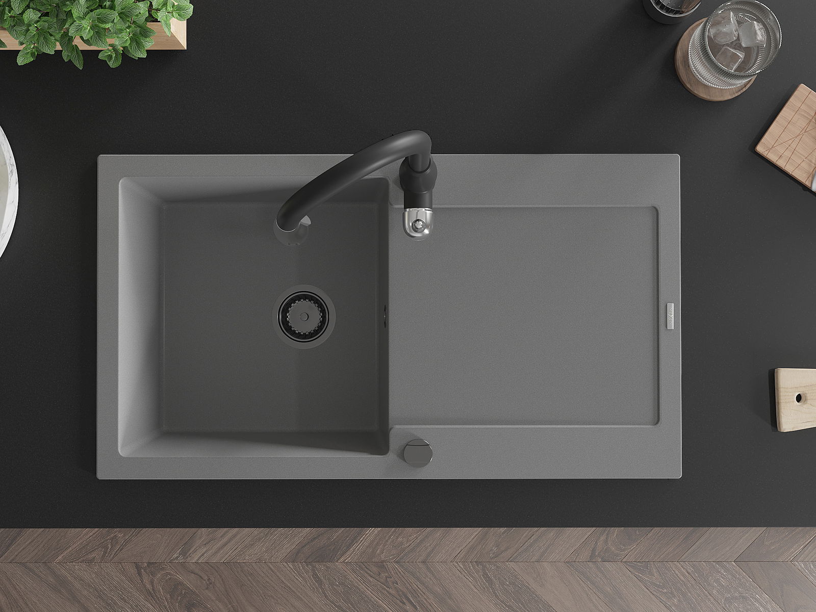 Mexen Leo virtuvės granito kriauklė su viena kamera, su nutekėjimu ir virtuviniu maišytuvu Savita, pilka - 6501-71-672601-70-B