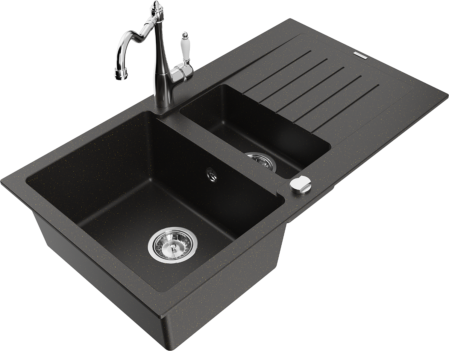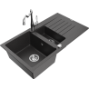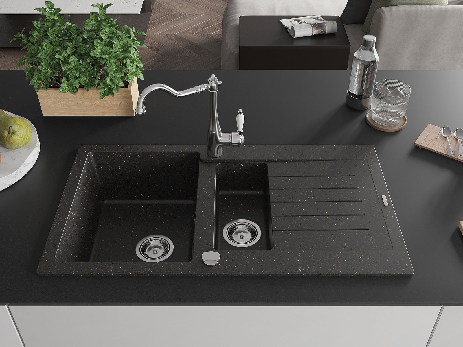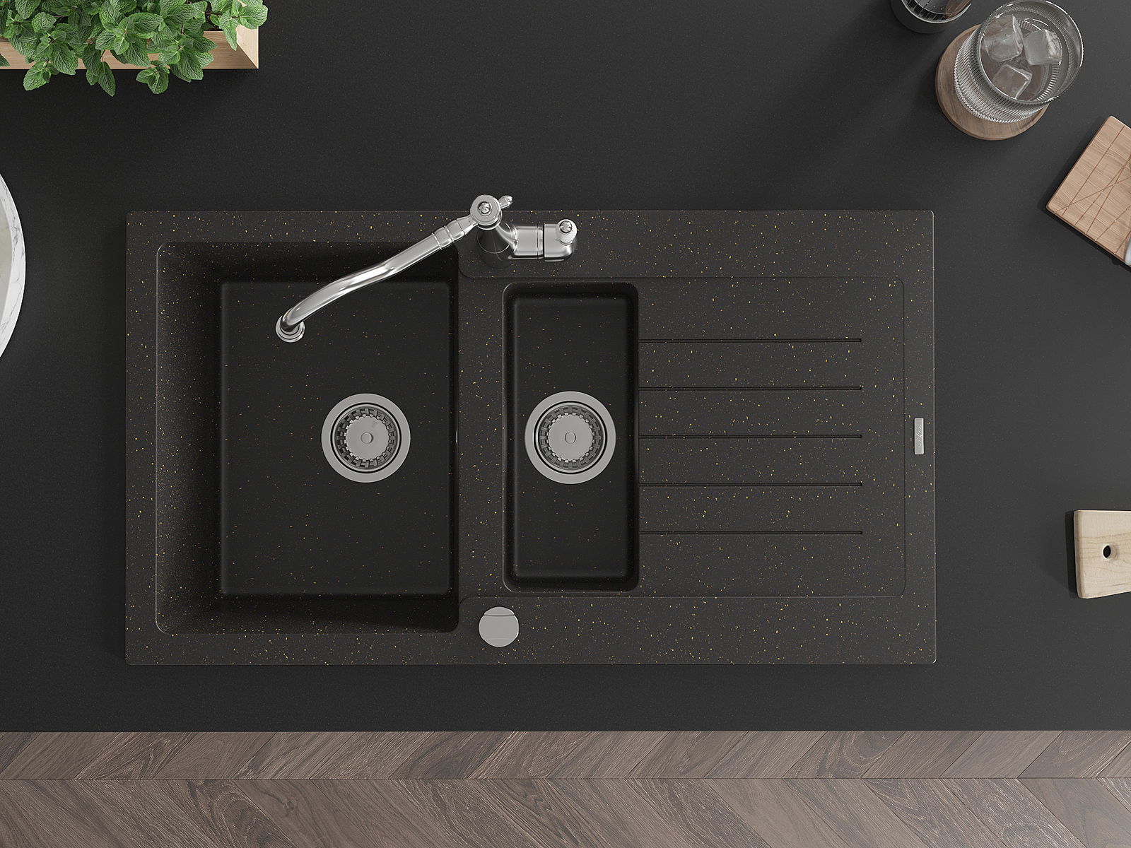 Mexen Matias granitinė plautuvė su 1,5 kameromis su lašintuvu ir virtuviniu maišytuvu Carla, juodas/auksinis metalikas