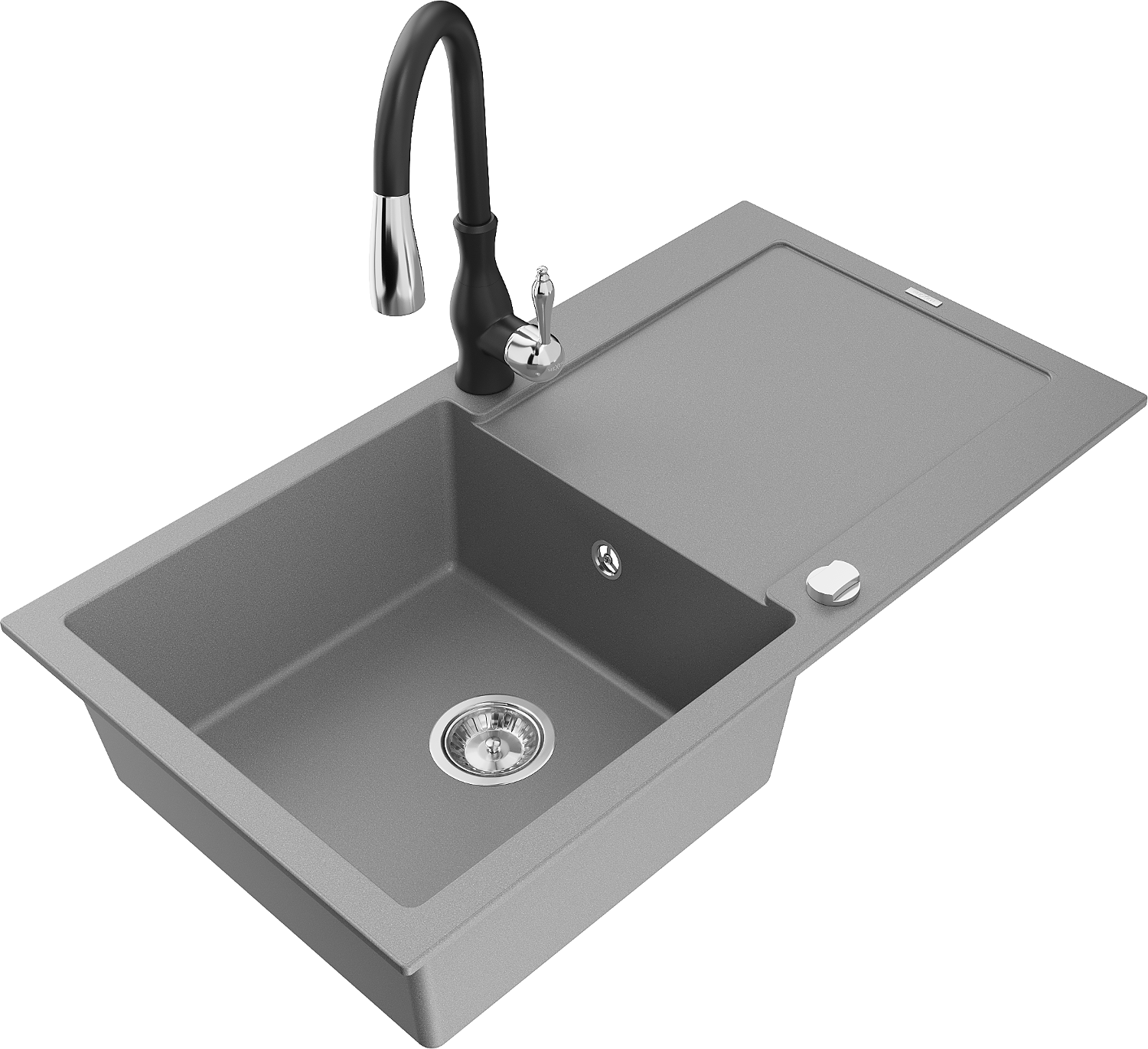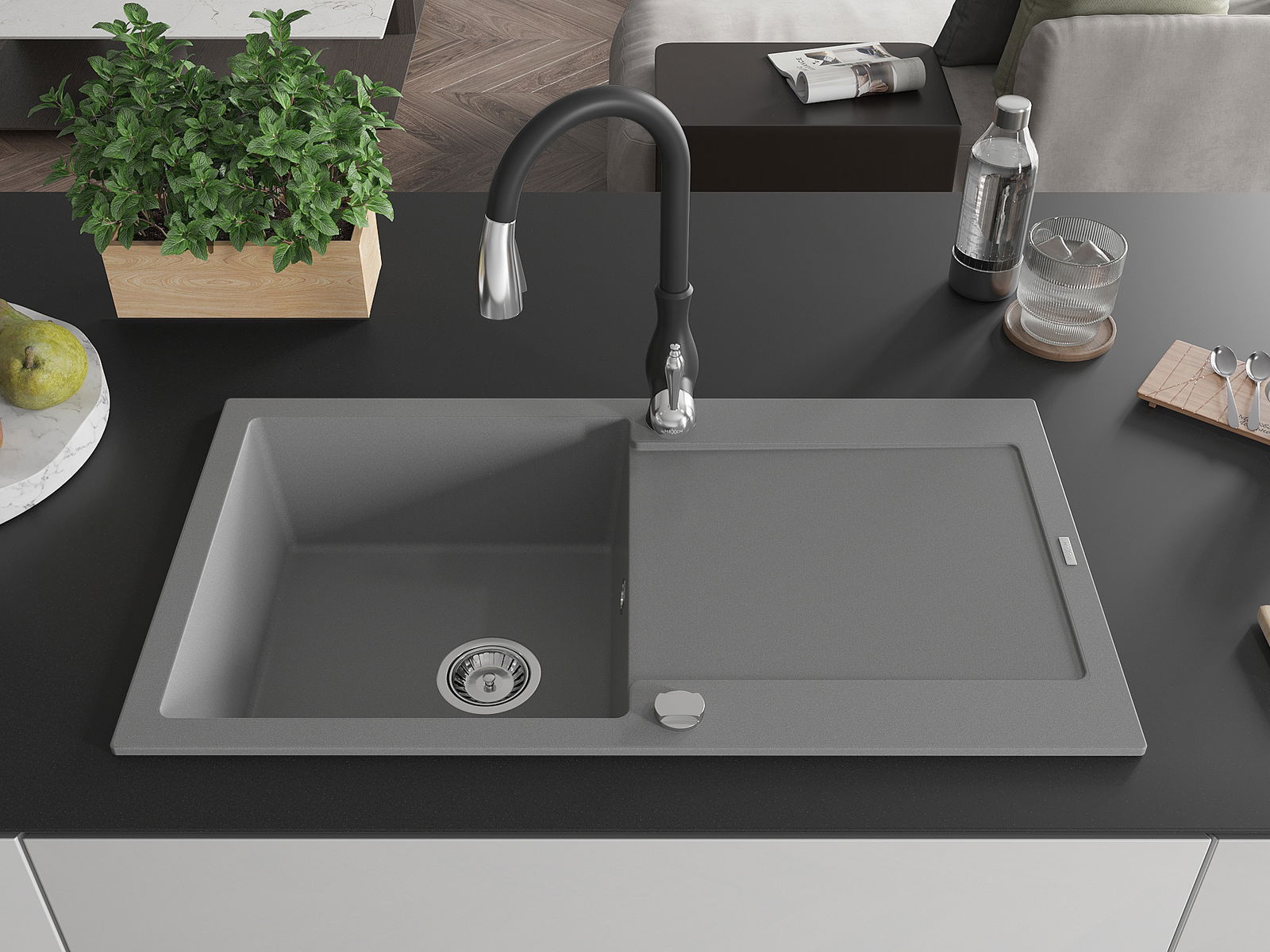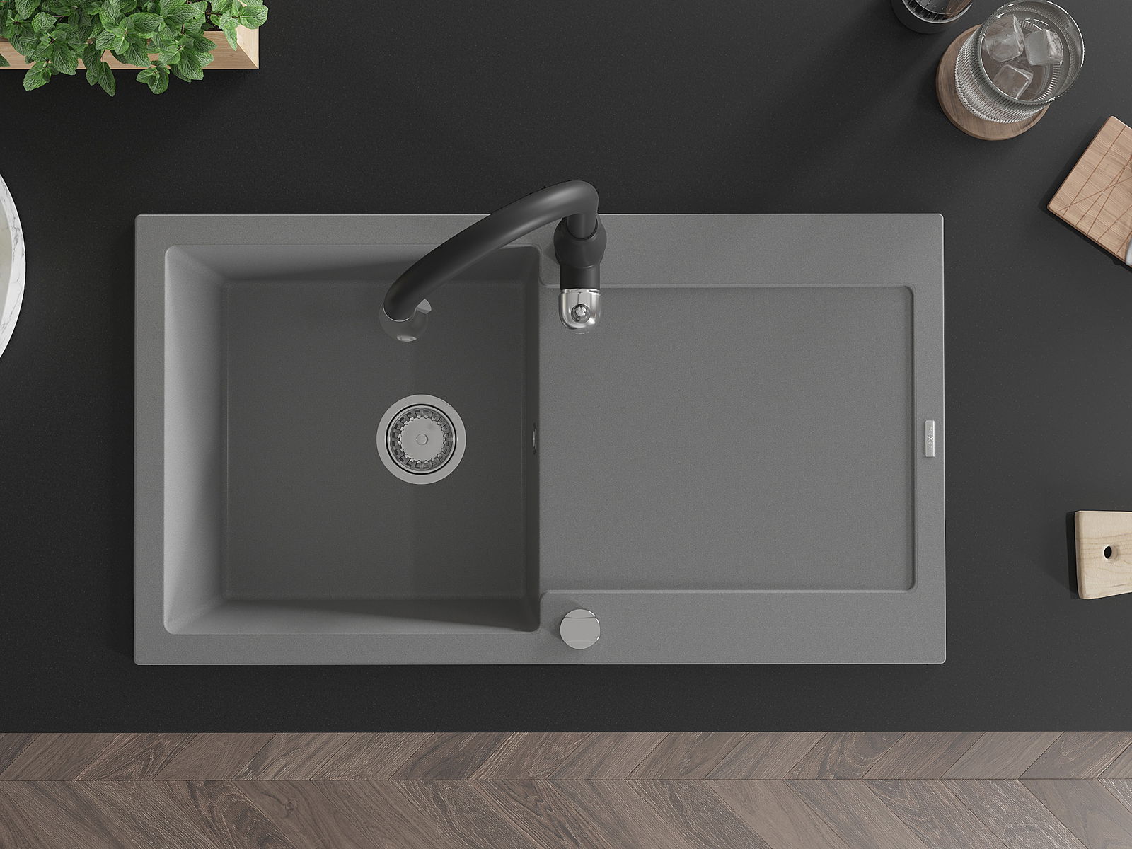 Mexen Leo granito virtuvės kriauklė su 1 skyriumi, nusausinimu ir virtuvės maišytuvu Savita, pilkos spalvos - 6501-71-672601-70