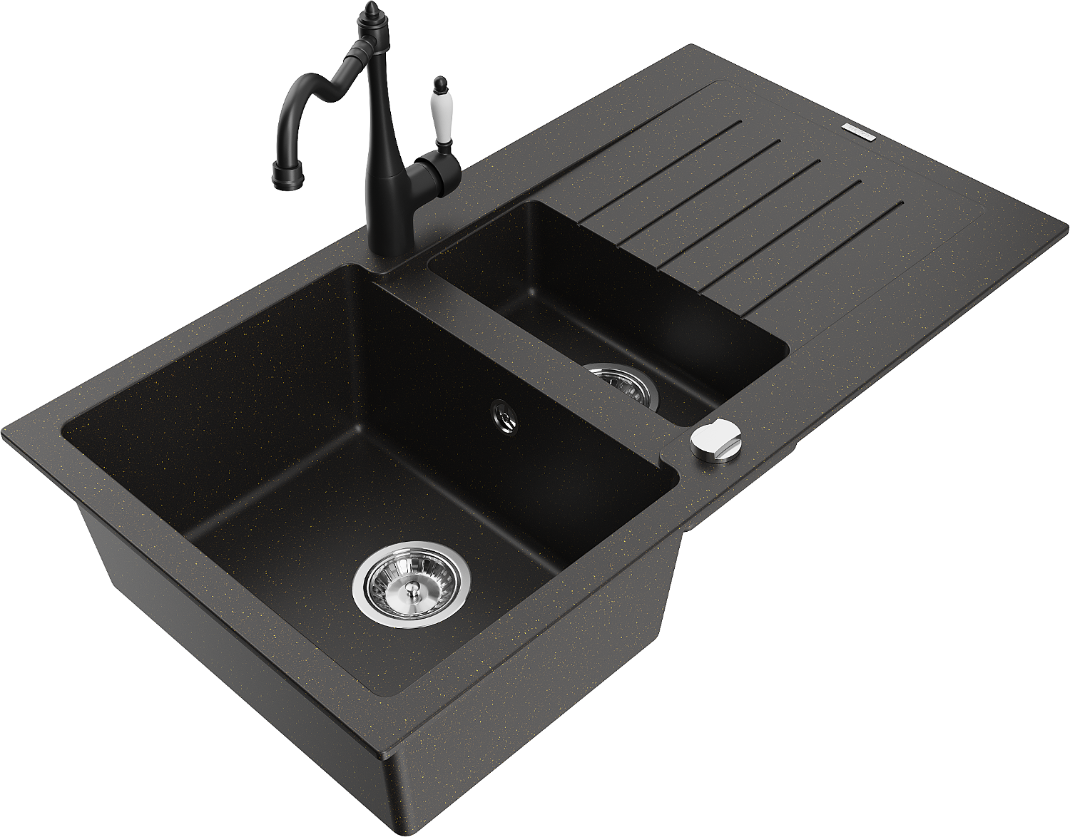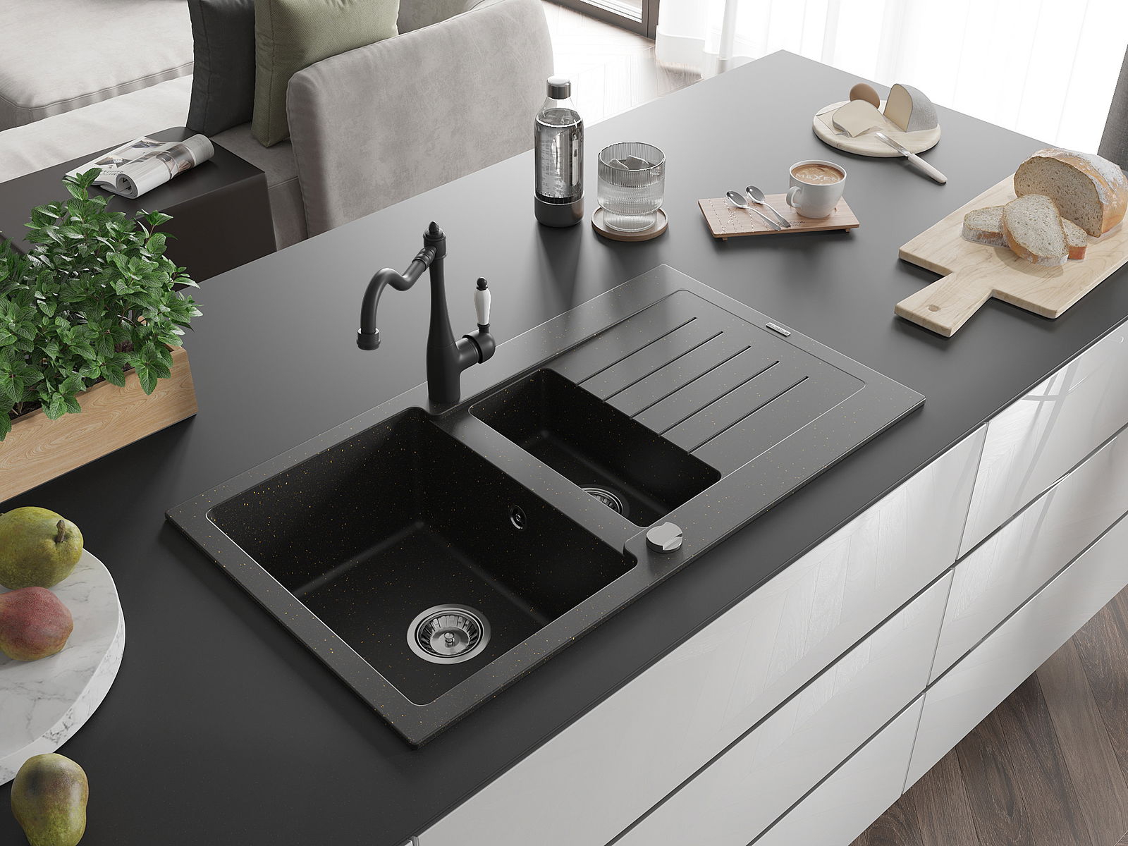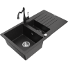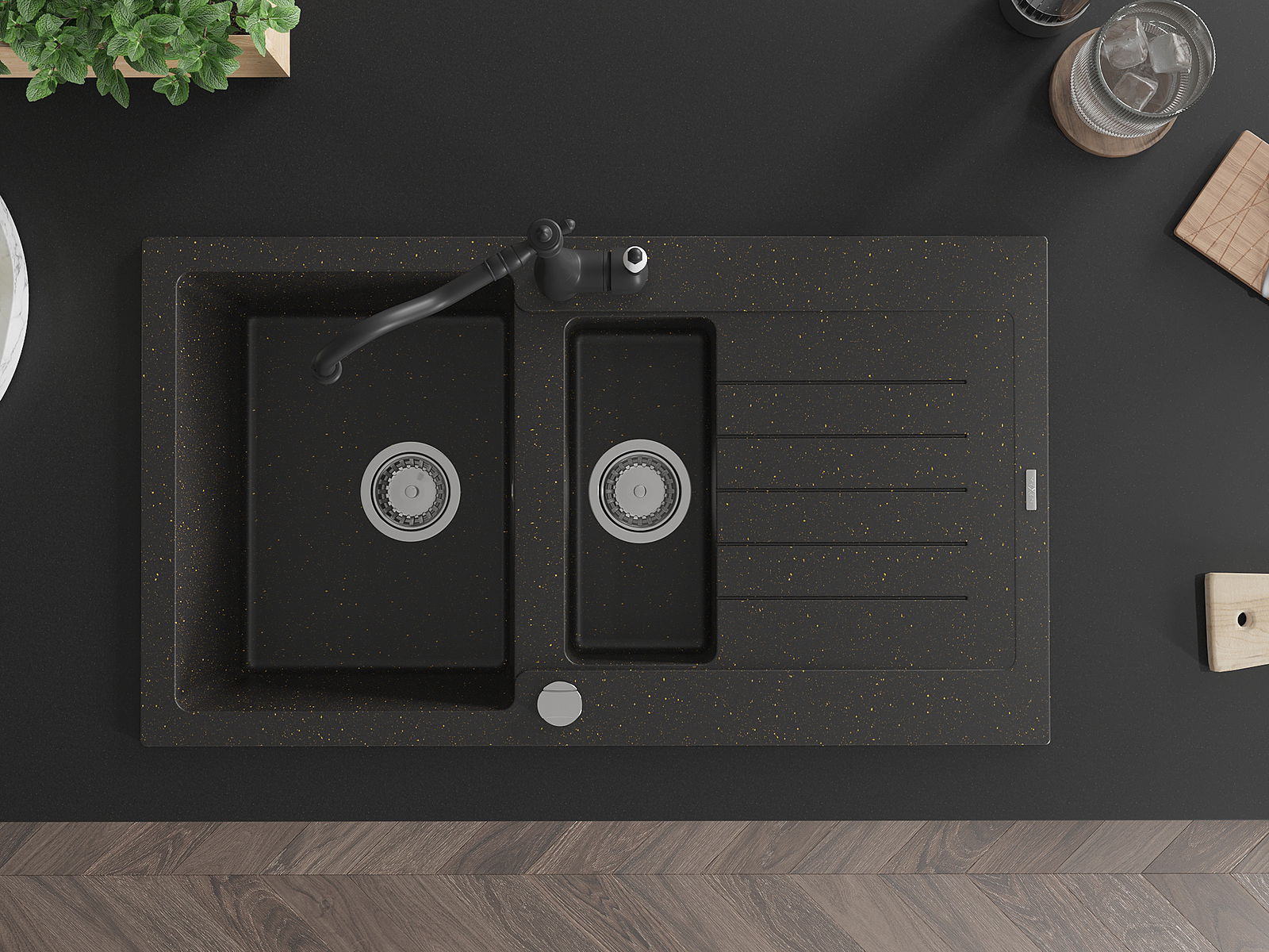 Mexen Matias granitinė plautuvė 1,5 skylių su nusausintuvu ir virtuviniu maišytuvu Carla juoda/auksinė metalo spalva