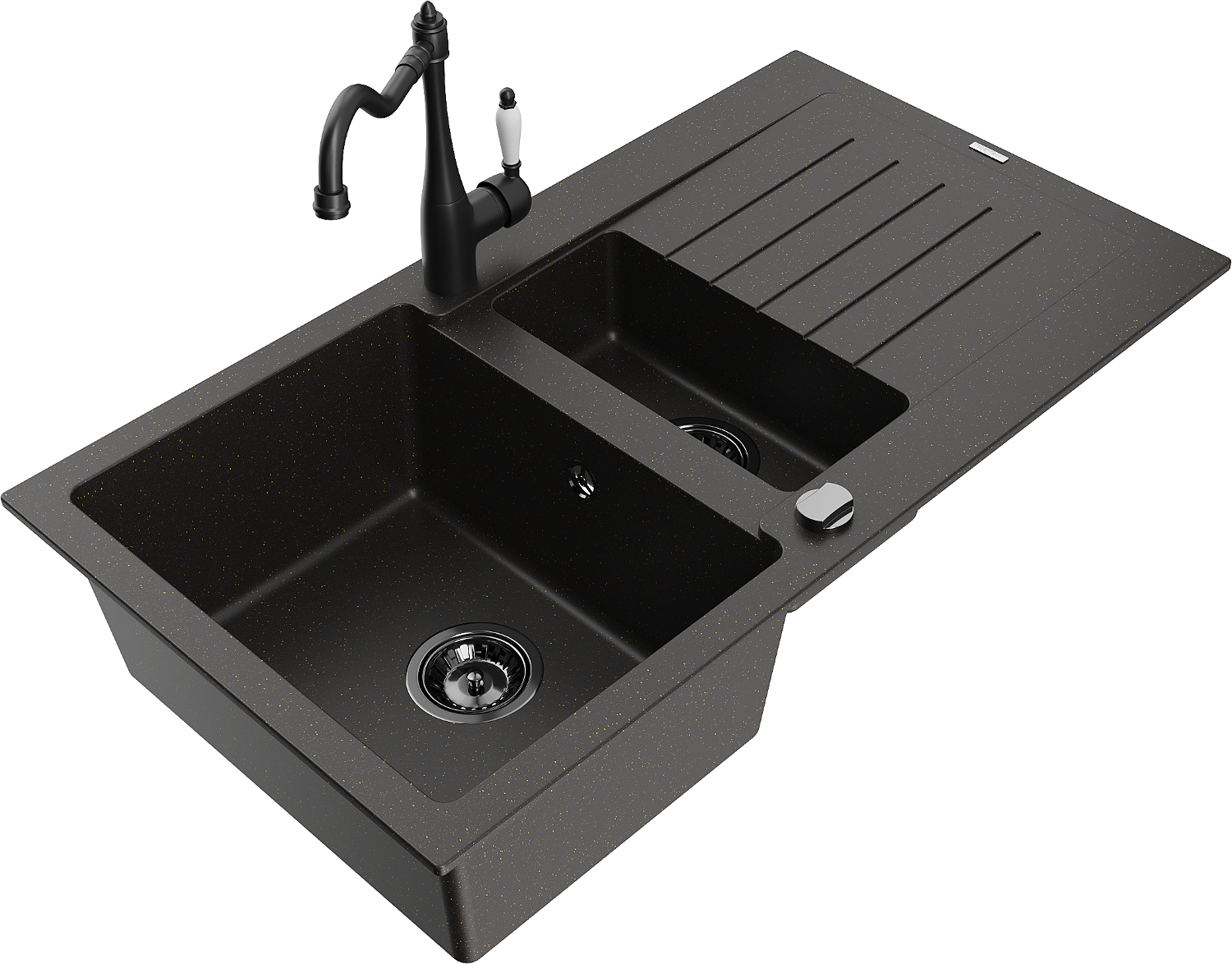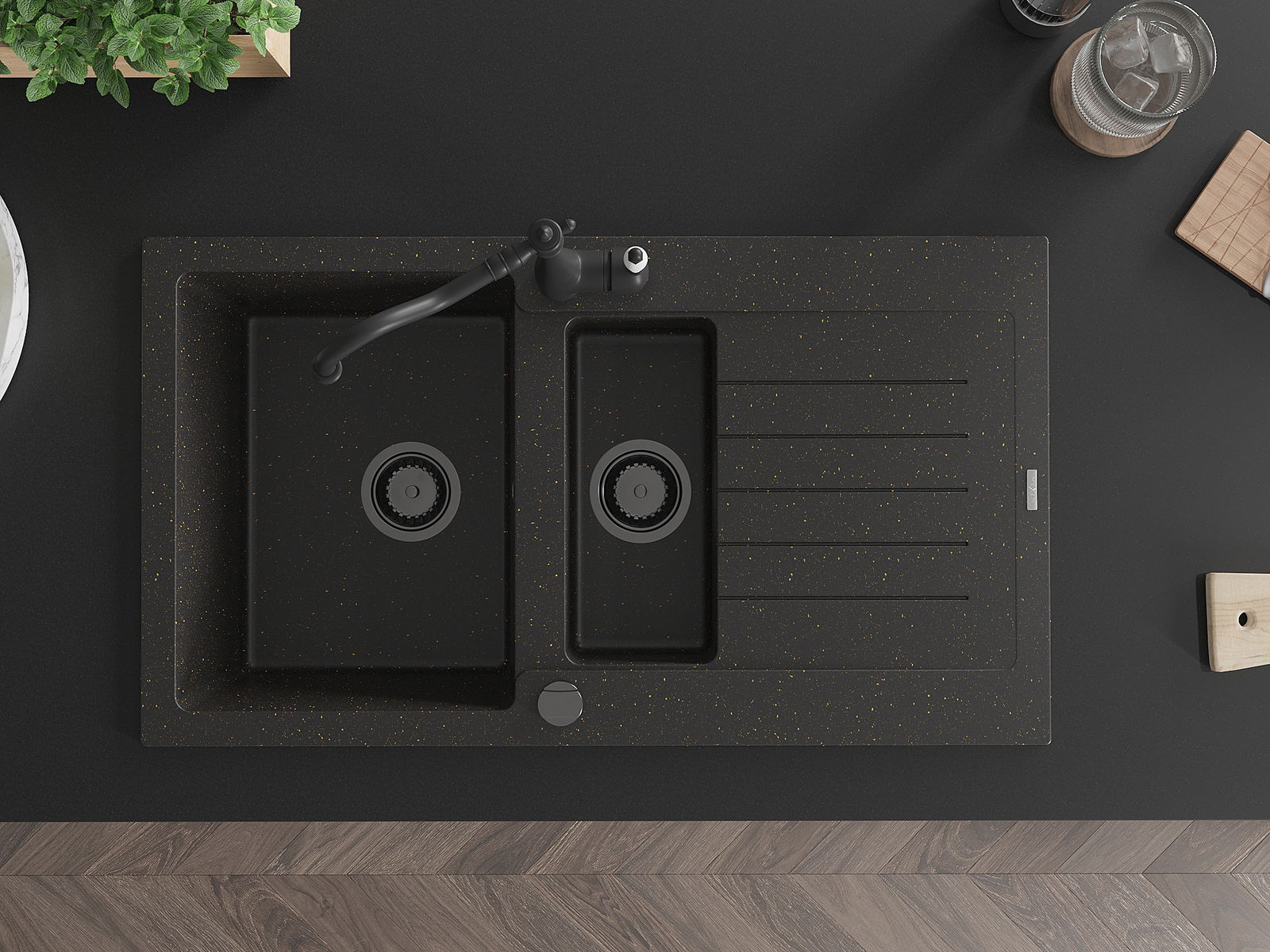 Mexen Matias granitinė virtuvės kriauklė su 1,5 kamera ir lašintuvu bei virtuviniu maišytuvu Carla juodas/auksinis
