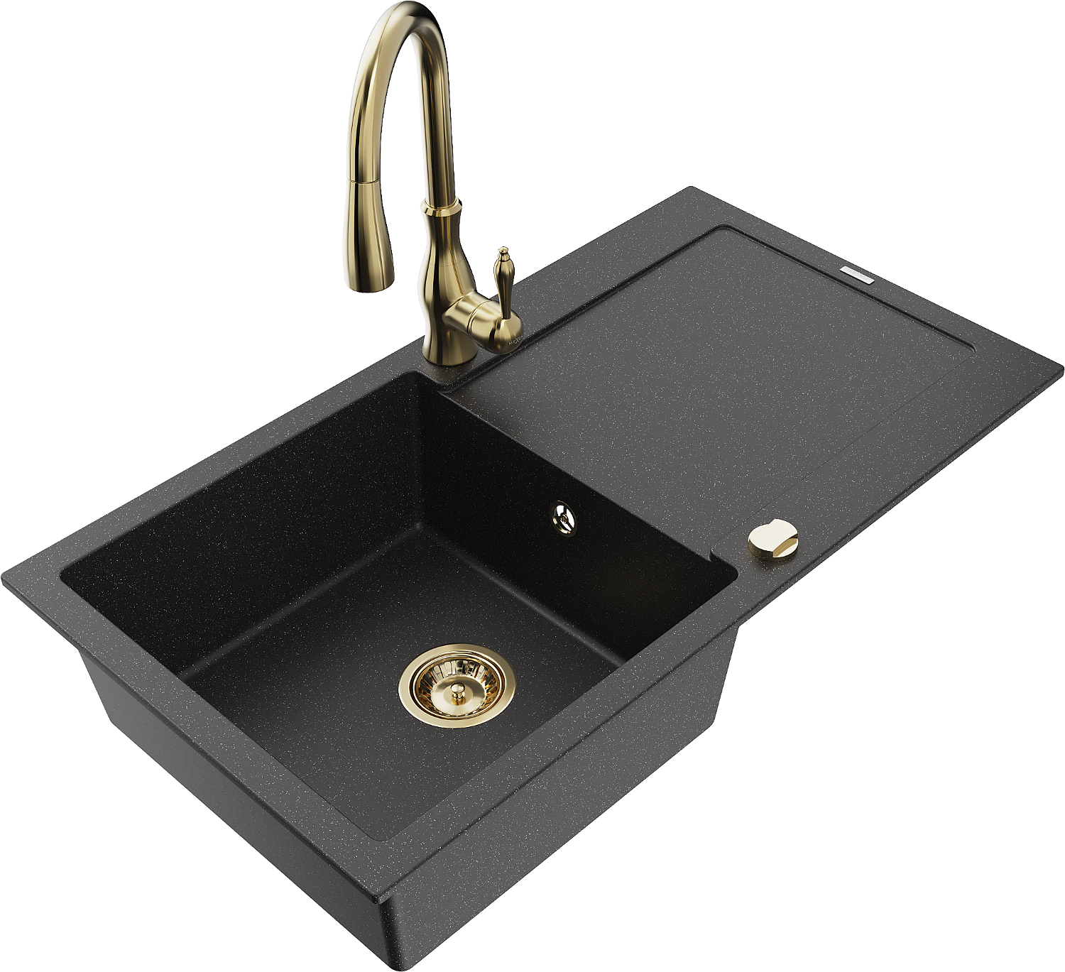 Mexen Leo granitinė plautuvė 1-sekcijų su nutekamu ir virtuviniu maišytuvu Savita, juoda/sidabrinis metalikas - 6501-73-672601-?