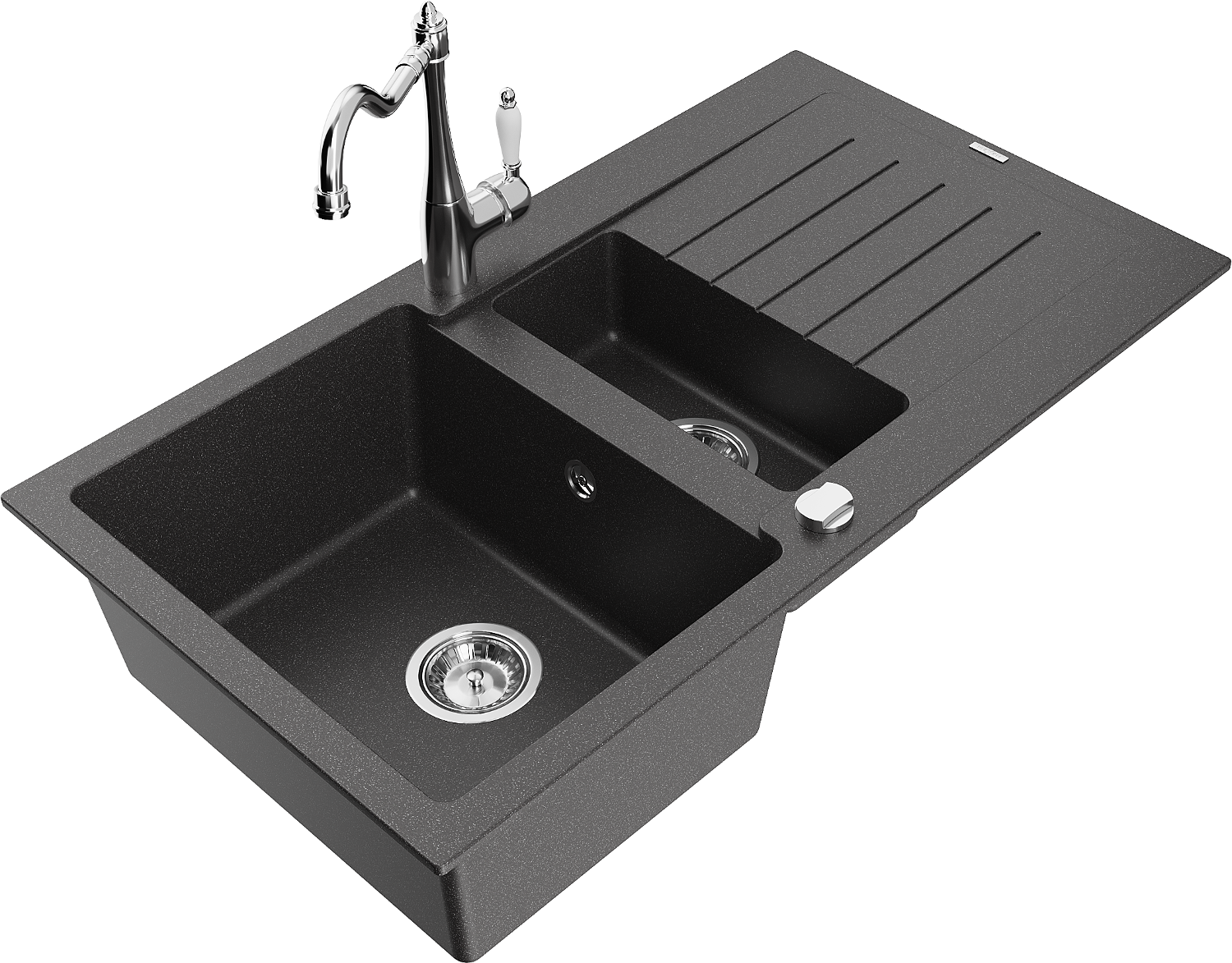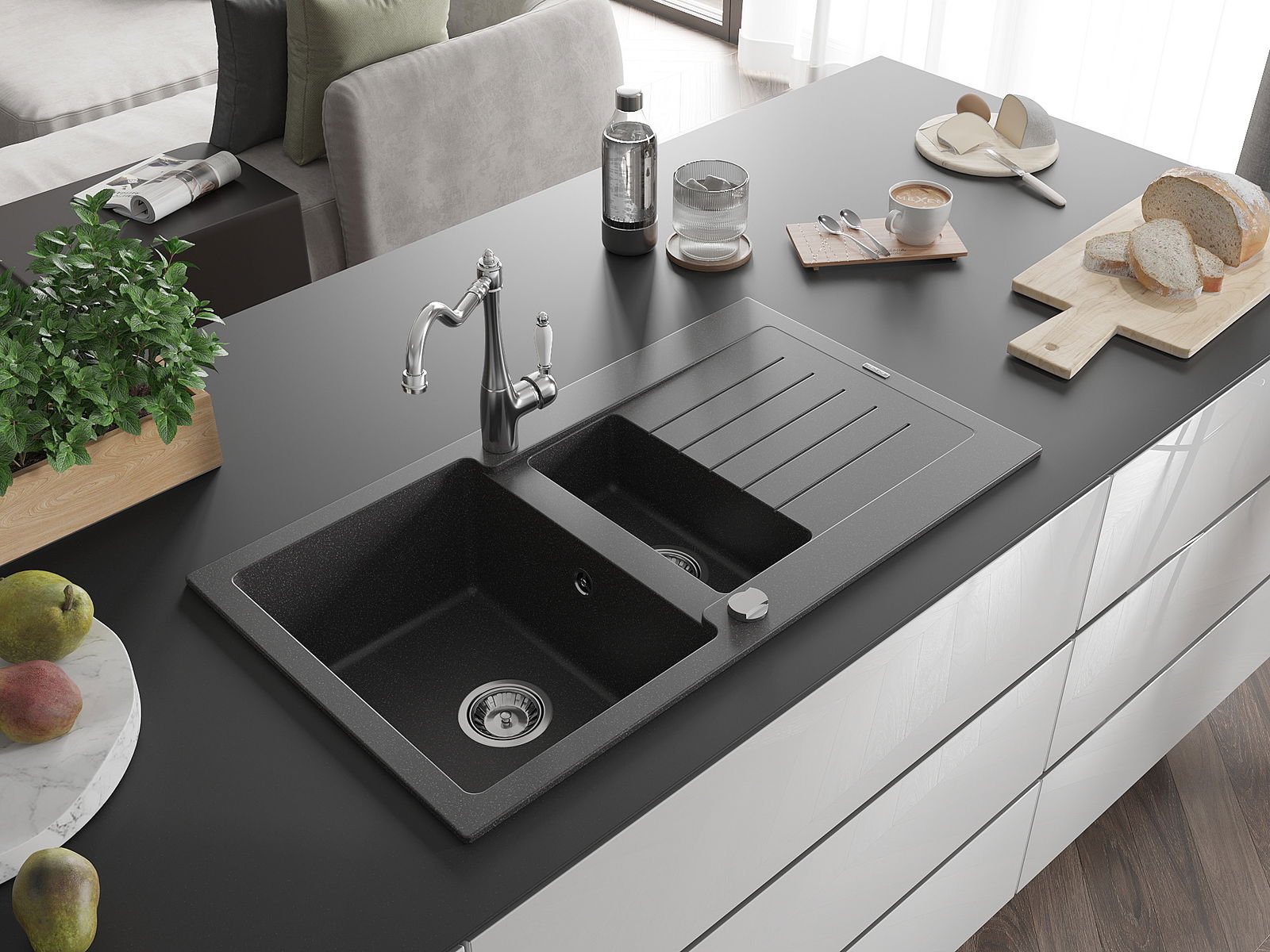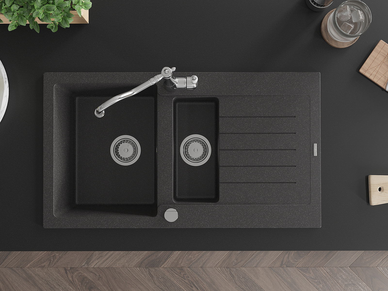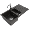Mexen Matias granitinė vienos su puse kameros plautuvė su nusausintuvu ir virtuvės maišytuvu Carla, juoda su taškeliais