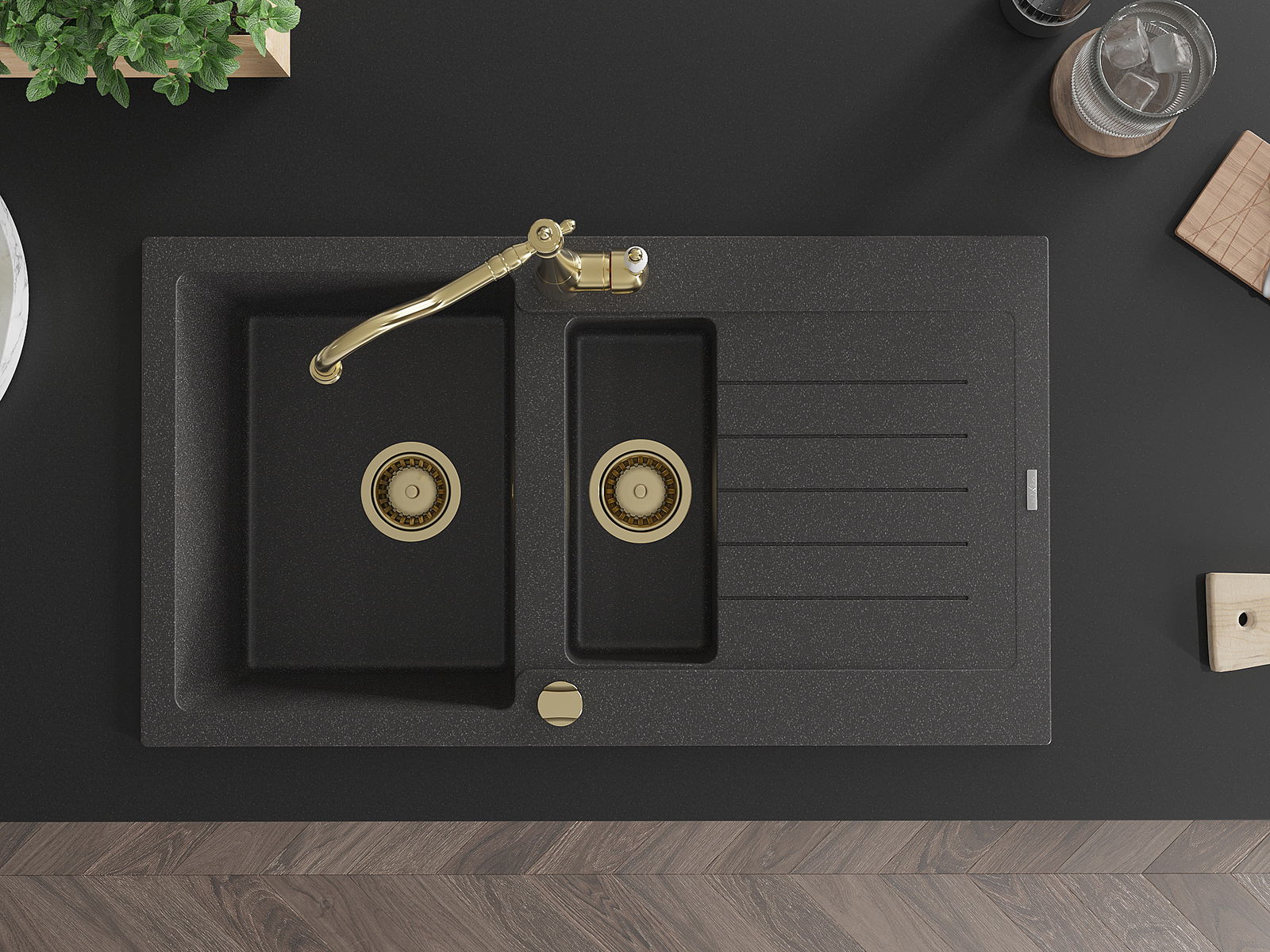 Mexen Matias granitinė 1,5-skylių kriauklė su nutekamu ir virtuviniu maišytuvu Carla, juodas dėmėtas - 6502-76-670700-50